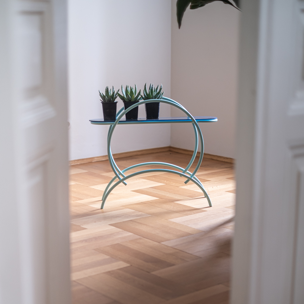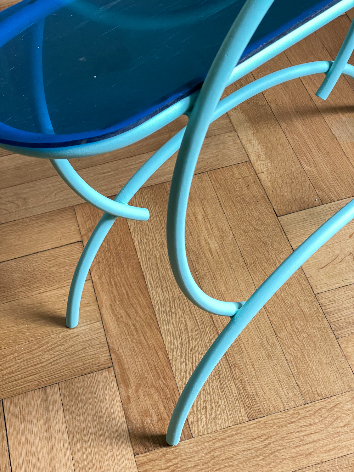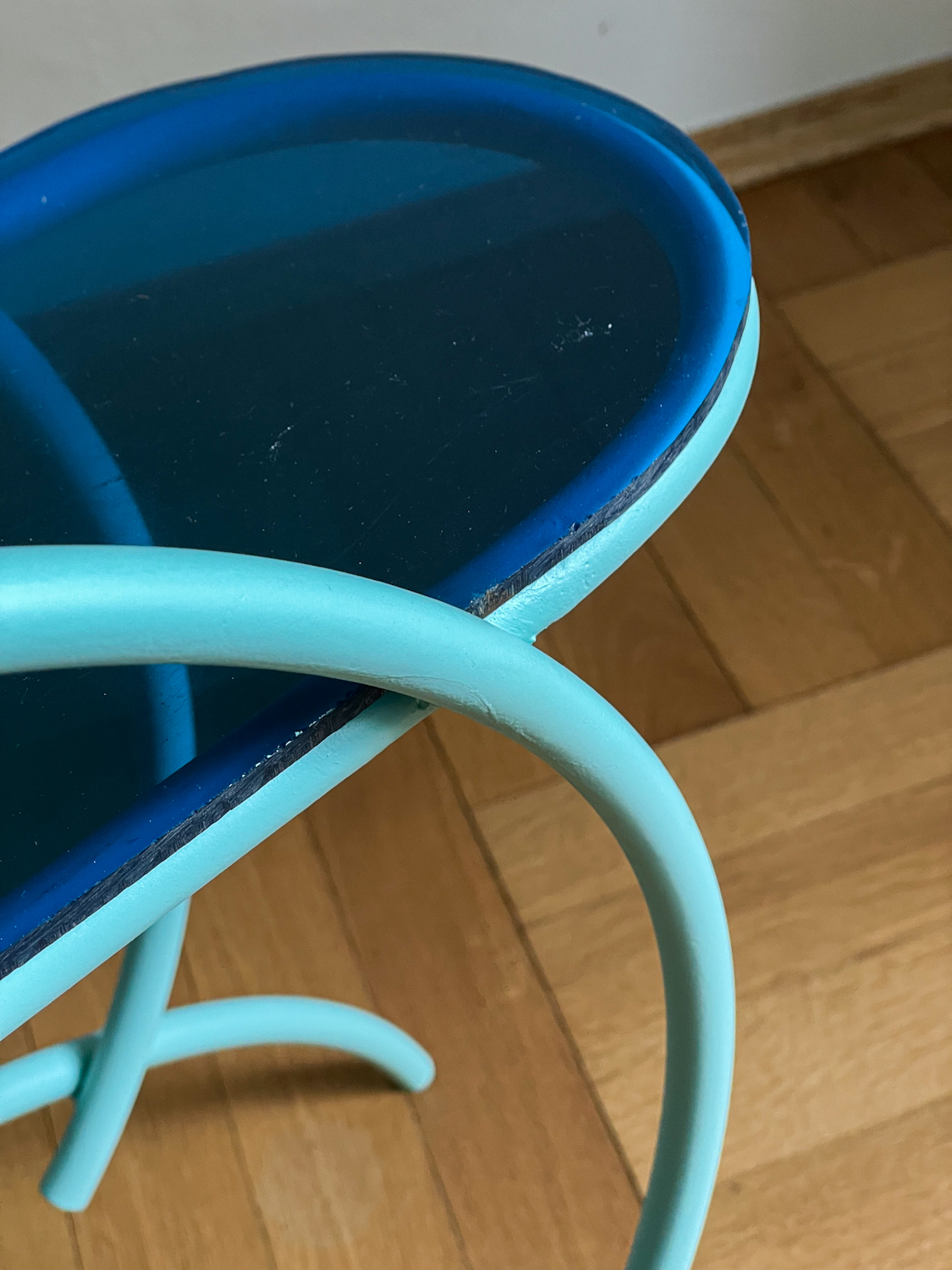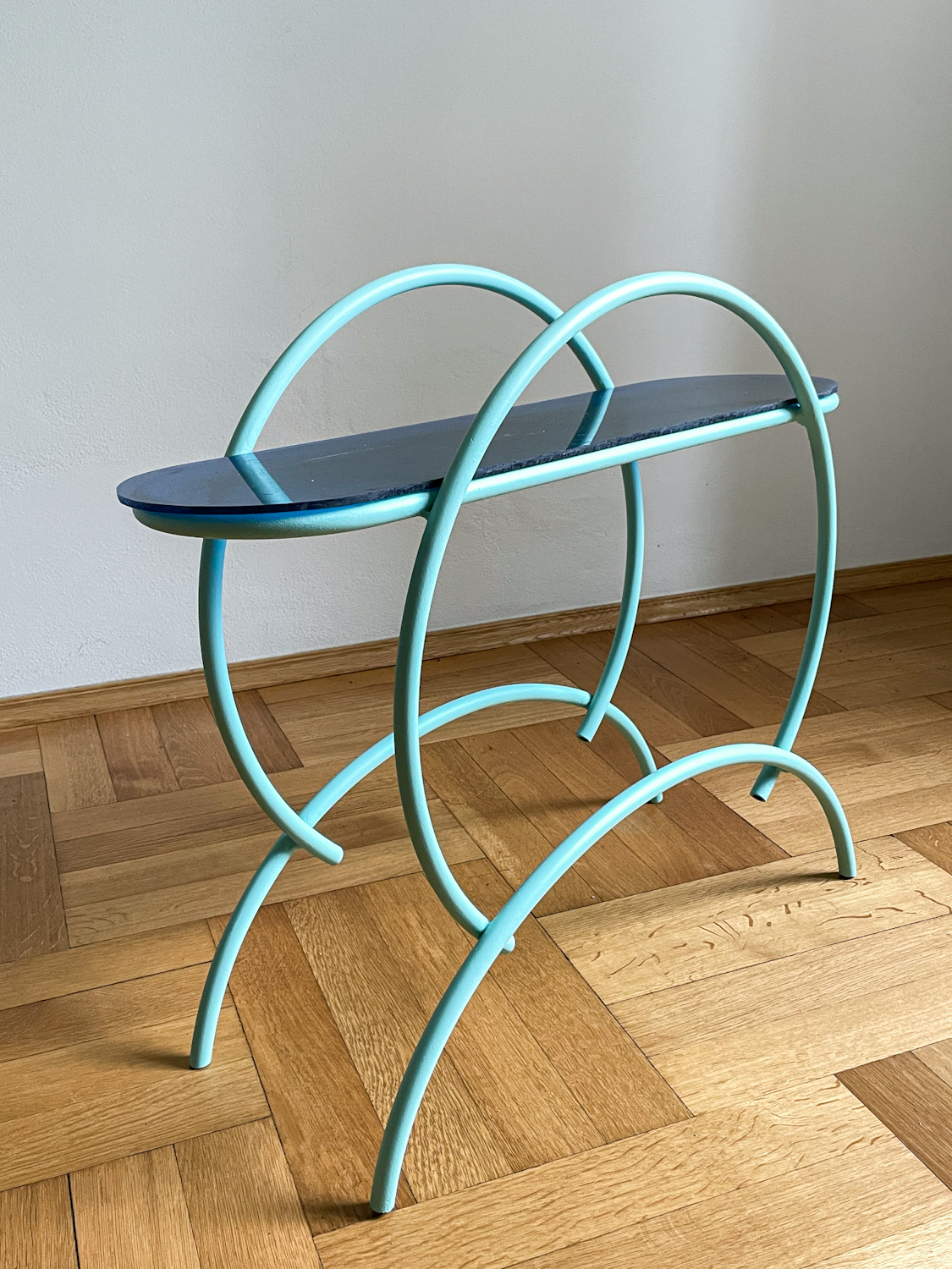 Trubkový stojan na květiny v mintové barvě z 50.-60. let pravděpodobn dělaný na zakázku. Polička je z barevného plastu, nátěr je nový.