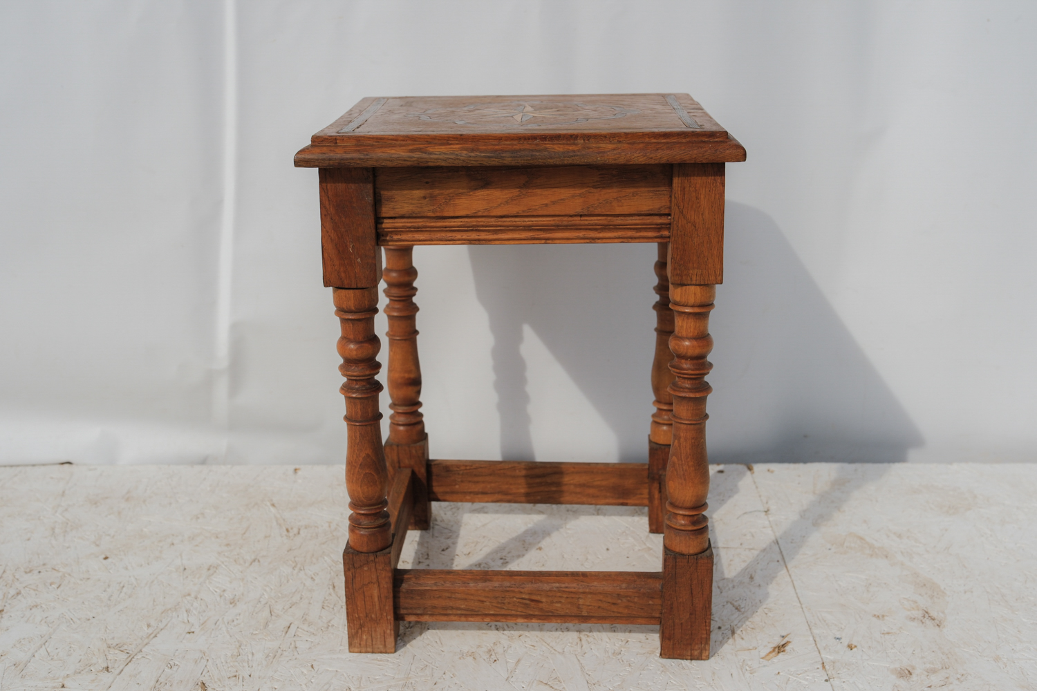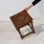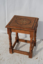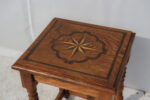 Menší stolek z masivního dřeva, který zaujme především svou výraznou deskou s intarzovaným motivem hvězdy. Jemná práce s kontrastními dýhami vytváří ornament, jenž působí téměř jako drobný šperk zasazený do jinak klidné plochy.
