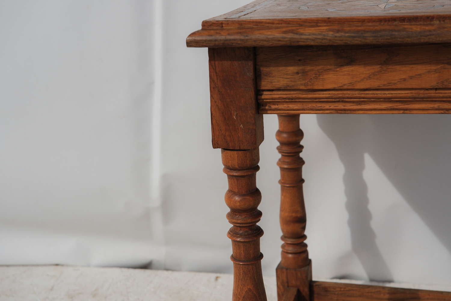 Tvar stolku nese klasické prvky – soustružené nohy, pevná konstrukce a proporčně vyvážená silueta odkazují na tradiční řemeslné zpracování, které stojí na preciznosti a detailu. Stylově lze kus zařadit přibližně do první poloviny 20. století, s vlivy historizujících forem, které byly v tomto období stále živé.