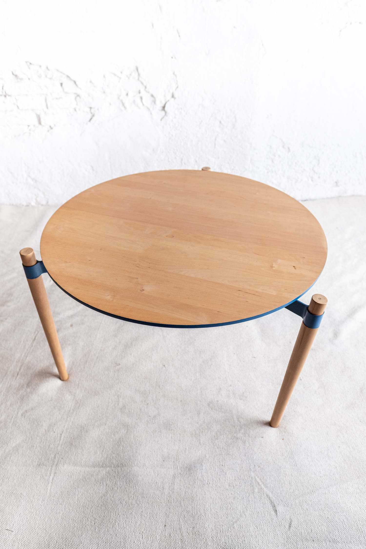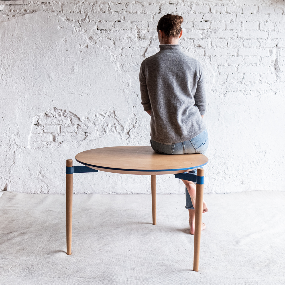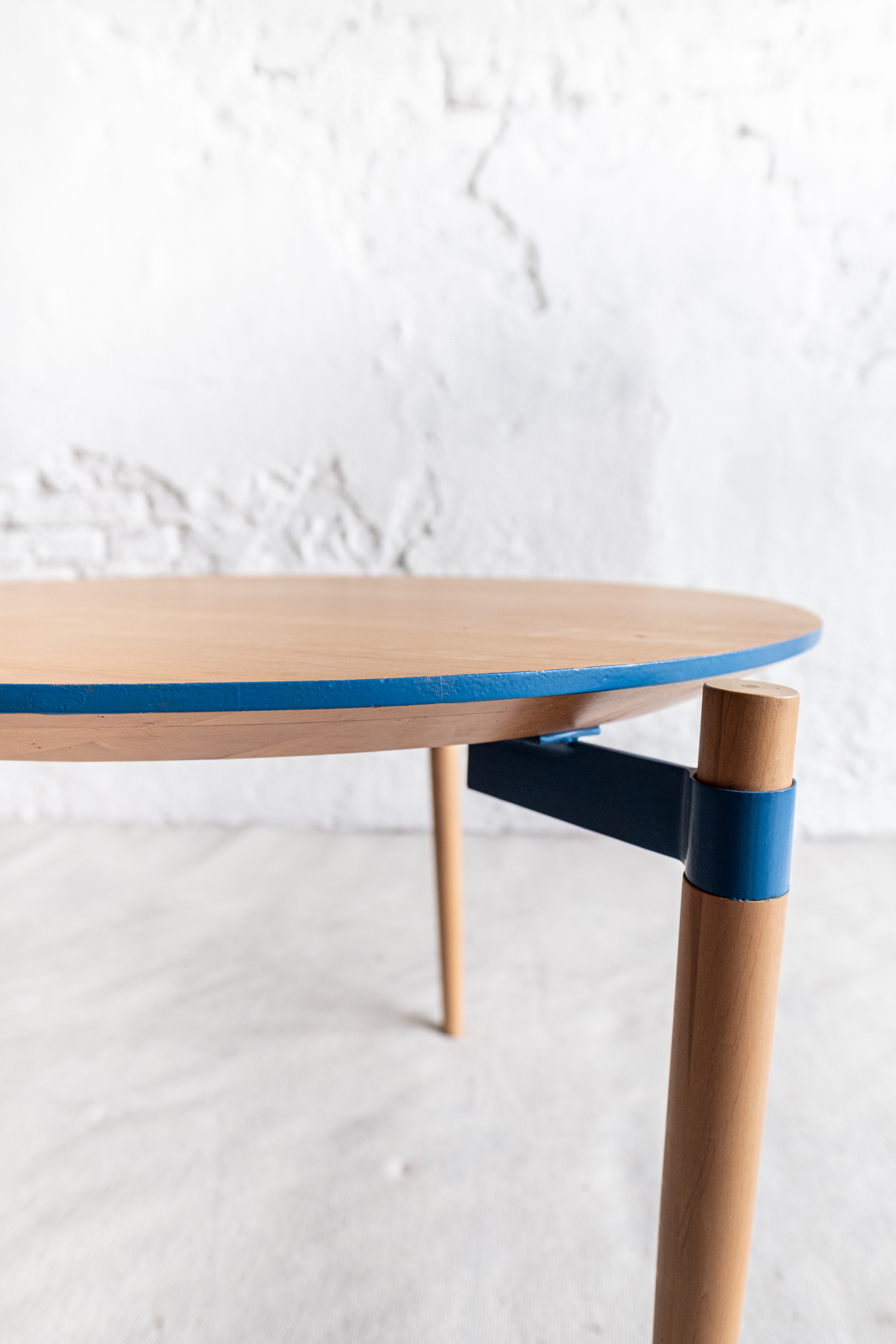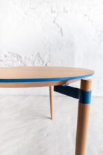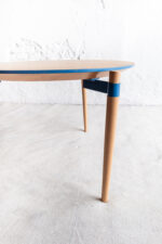 Kulatý konferenční stolek z jasanu pochází z naší dílny. Má velmi moderní ráz, ale tvarem nohou připomína styl brusel. Modrá barva kovových prvků se opakuje na hraně stolu, která je zešikmena.
