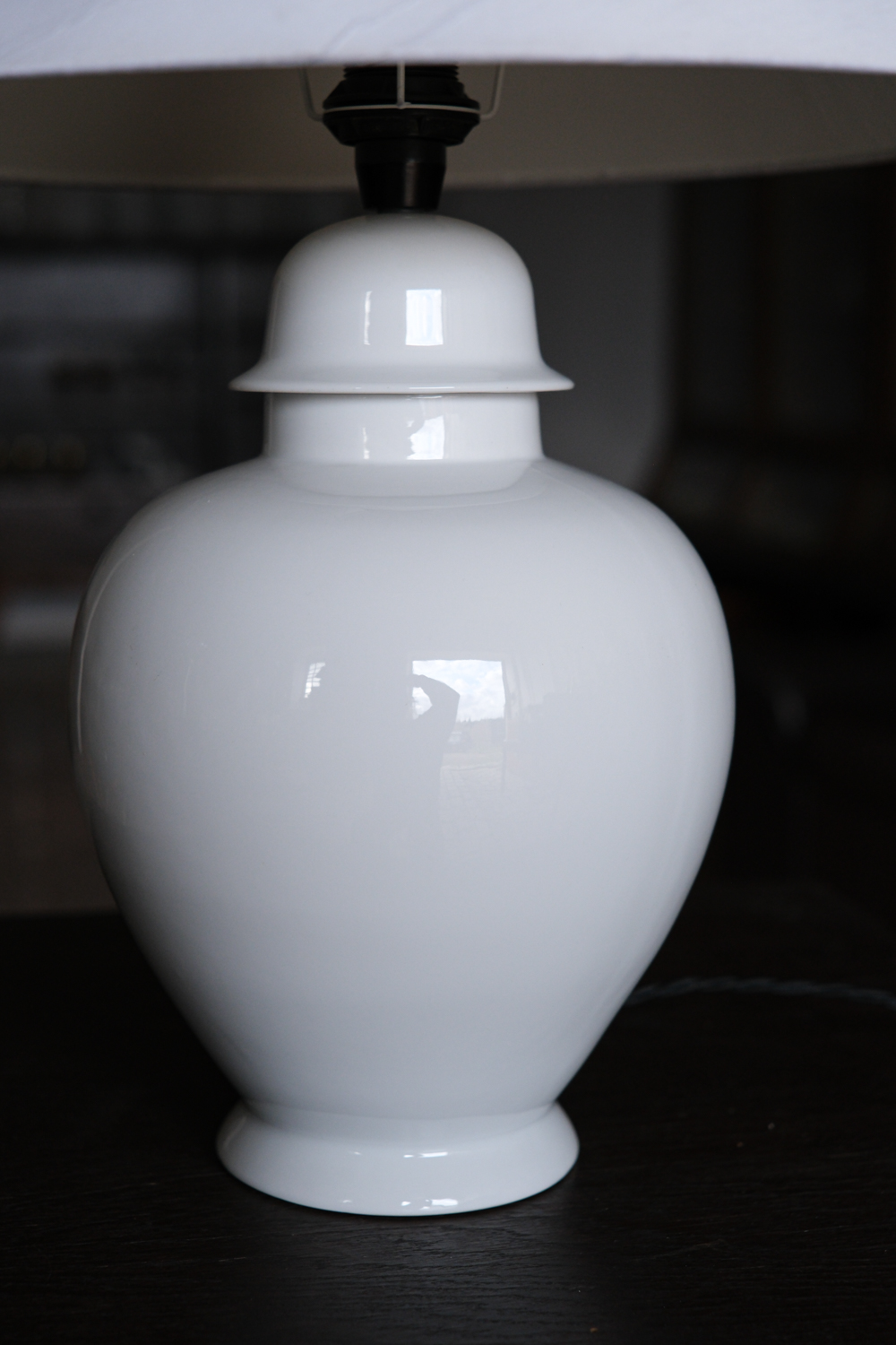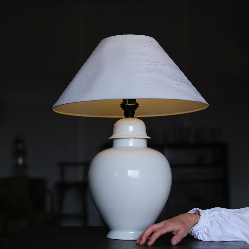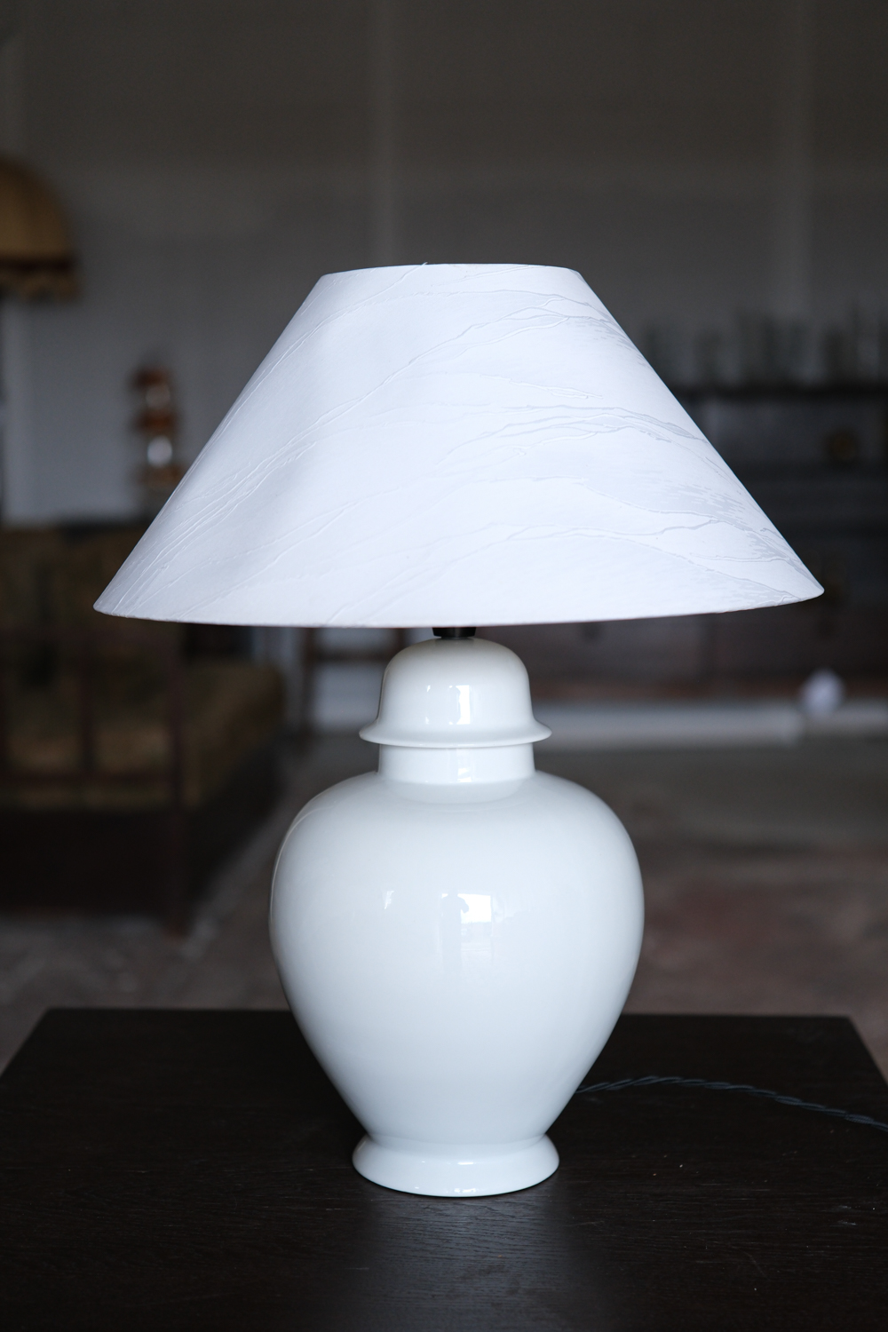 Stolní lampa s keramickou nohou v čistě bílé glazuře, která působí klidně a vyváženě. Tvarově vychází z klasických siluet, ale díky zjednodušení a hladkému povrchu dobře zapadá do estetiky druhé poloviny 20. století.
