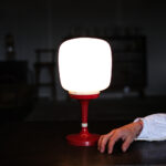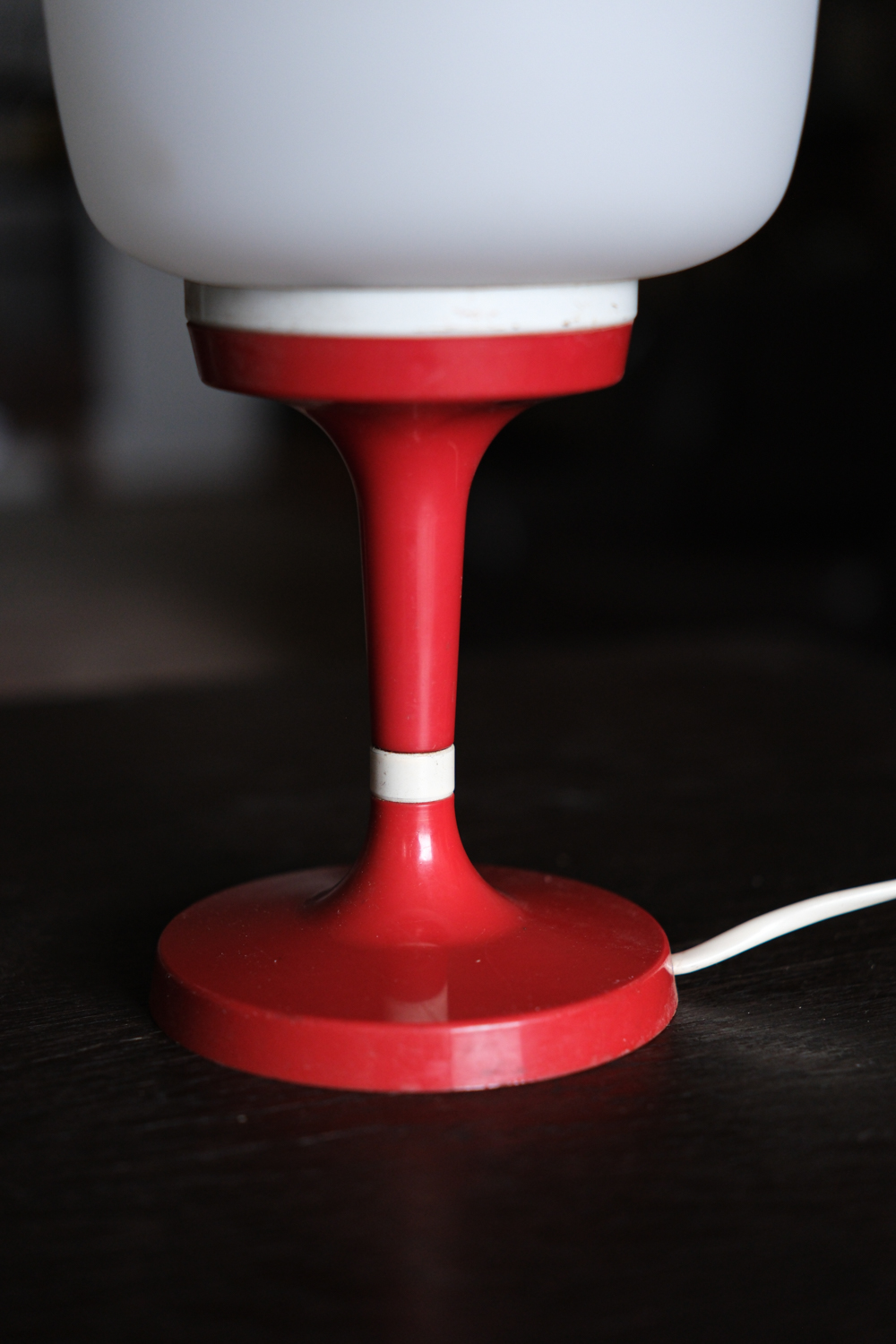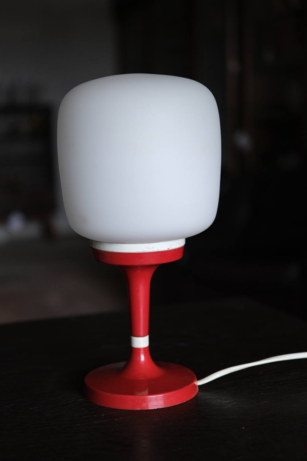 Stolní lampa s typickým „pohárovým“ tvarem, který se objevuje v 60. a 70. letech v souvislosti s nástupem plastů a inspirací space age estetikou. Kombinace sytě červené podstavy a opálového stínidla působí výrazně, ale zároveň čistě. Jednoduchý, dobře čitelný návrh, kde barva a tvar hrají hlavní roli.