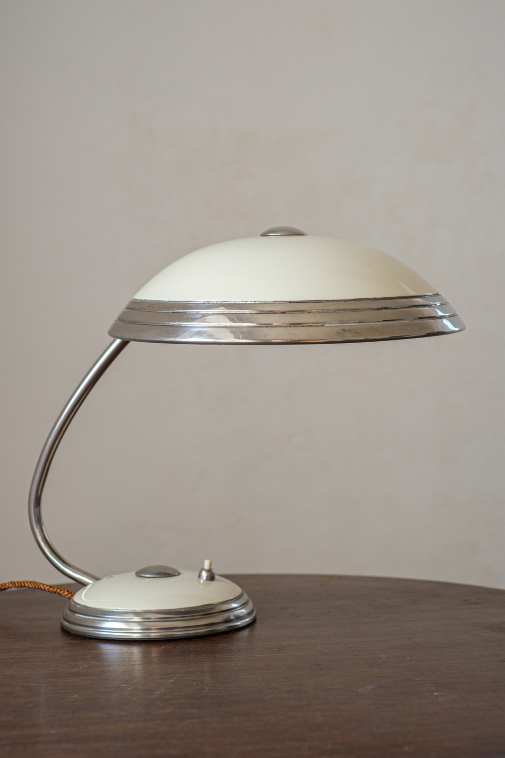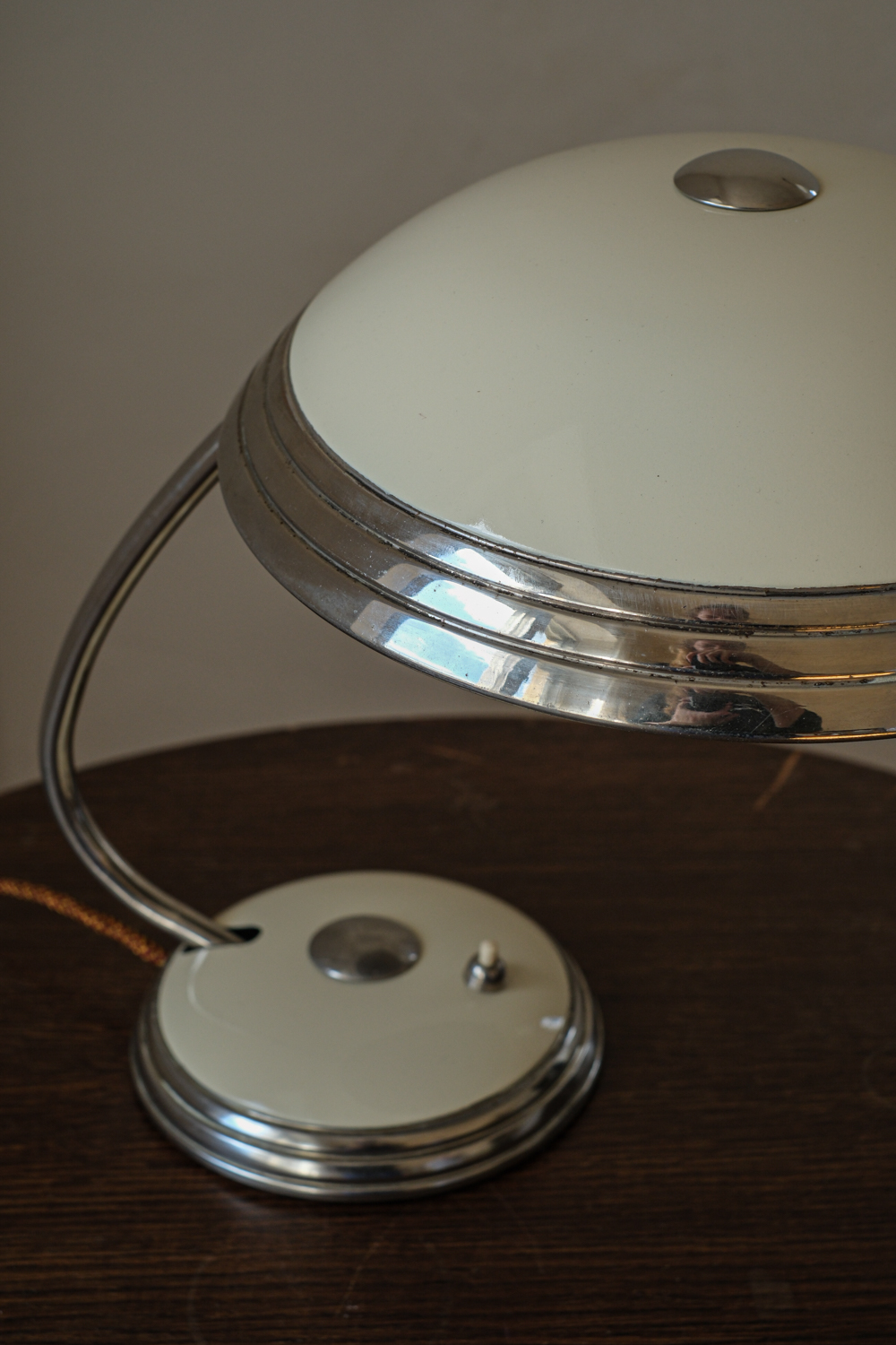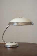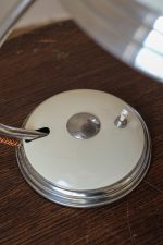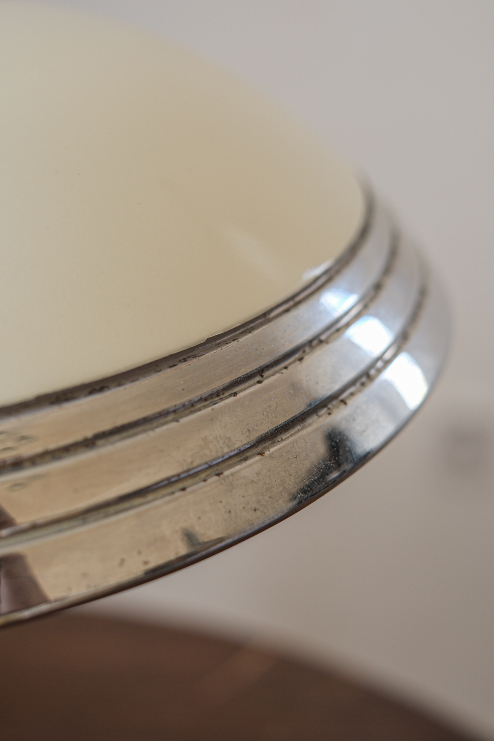 Kovové tělo s chromovanými prvky a jemně krémovým lakem vytváří harmonii tvarů i materiálů – od zaoblené základny po ikonické široké stínidlo se soustřednými kruhy. Typické pro 50. léta, kdy se technická preciznost spojovala s jemnou elegancí. Lampa působí robustně a přitom lehce, s jasným odkazem na styl Art Deco přecházející do modernismu.