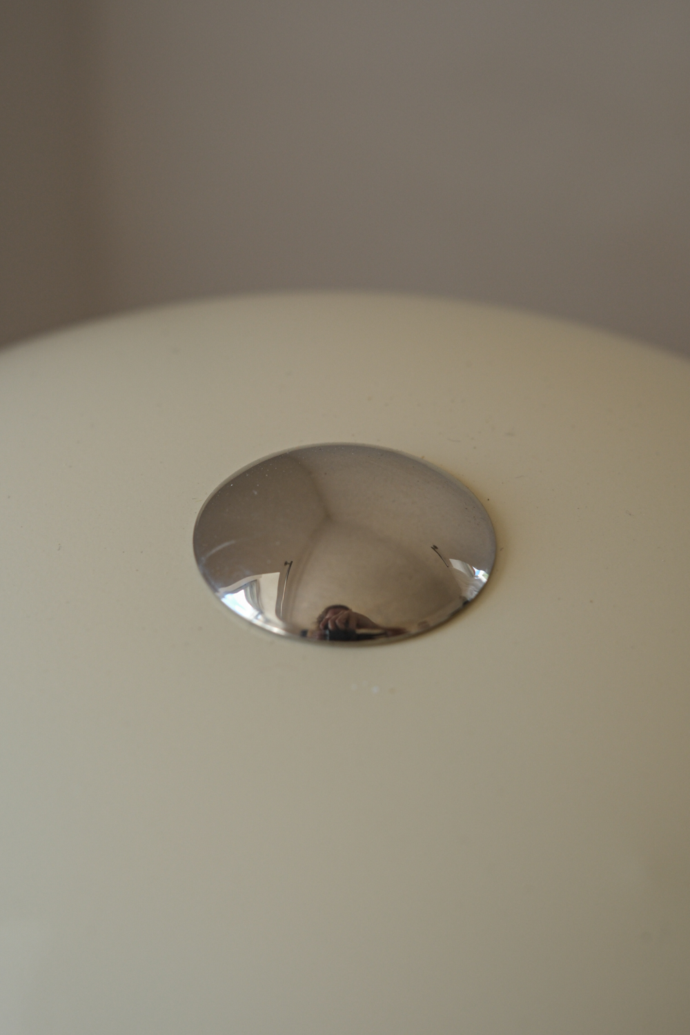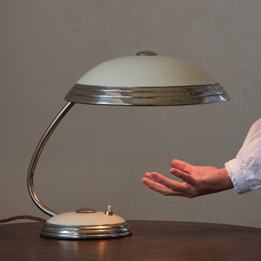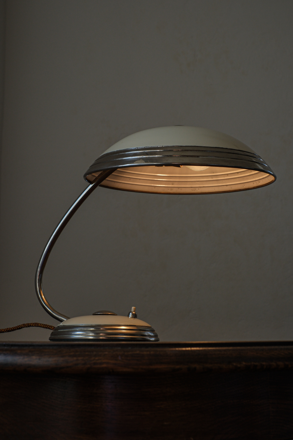 Kovové tělo s chromovanými prvky a jemně krémovým lakem vytváří harmonii tvarů i materiálů – od zaoblené základny po ikonické široké stínidlo se soustřednými kruhy. Typické pro 50. léta, kdy se technická preciznost spojovala s jemnou elegancí. Lampa působí robustně a přitom lehce, s jasným odkazem na styl Art Deco přecházející do modernismu.