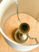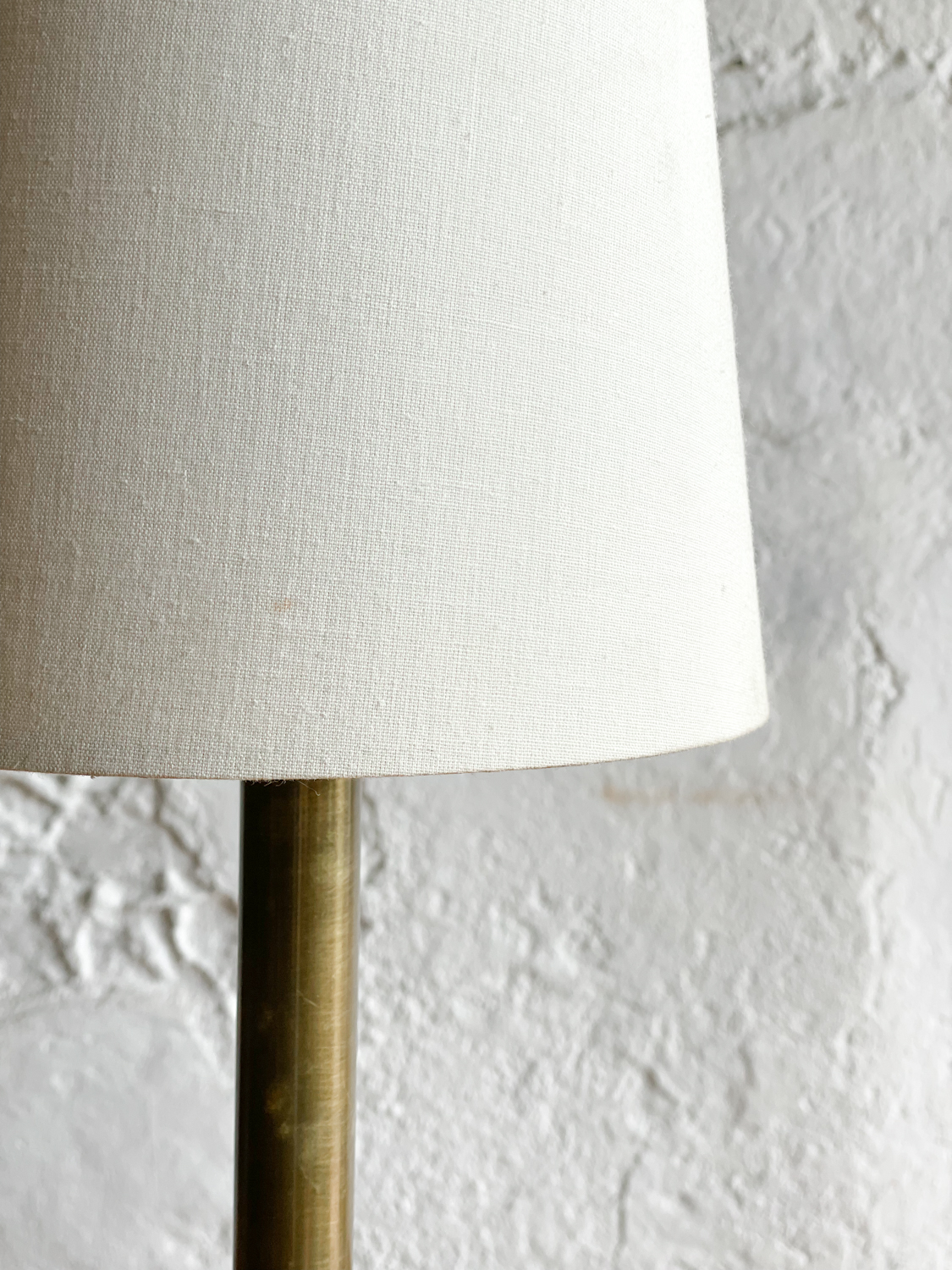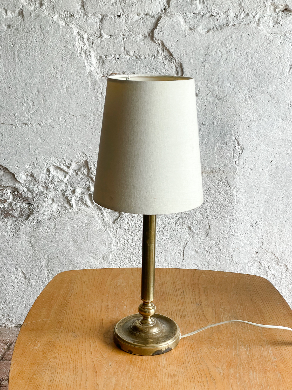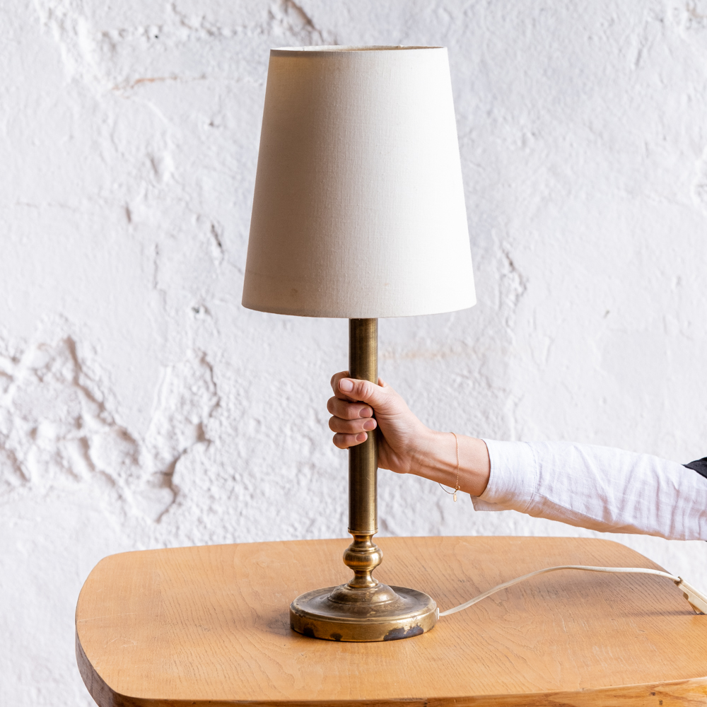 Minimalistická stolní lampička na mosazné štíhlé noze s jednoduchým textilním stínidlem.