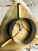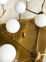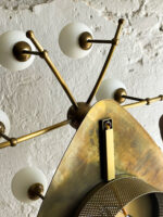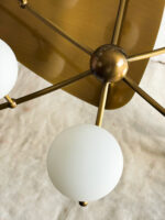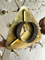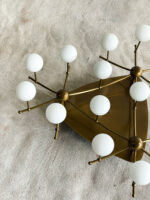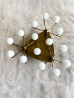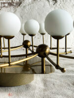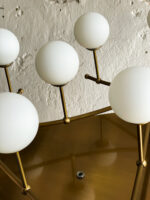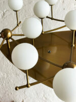 U tohoto lustru se nám sice nepodařilo dohledat původ, ale je naprosto unikátní. Velký stropní lustr v kombinaci mosazi a několika malých koulí z opálového skla, které tvoří nepravidelné hvězdice.