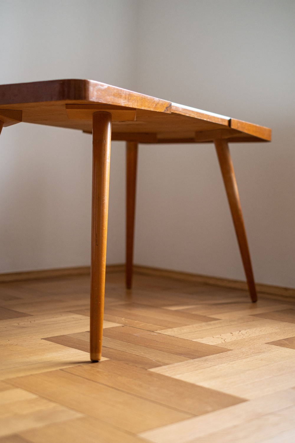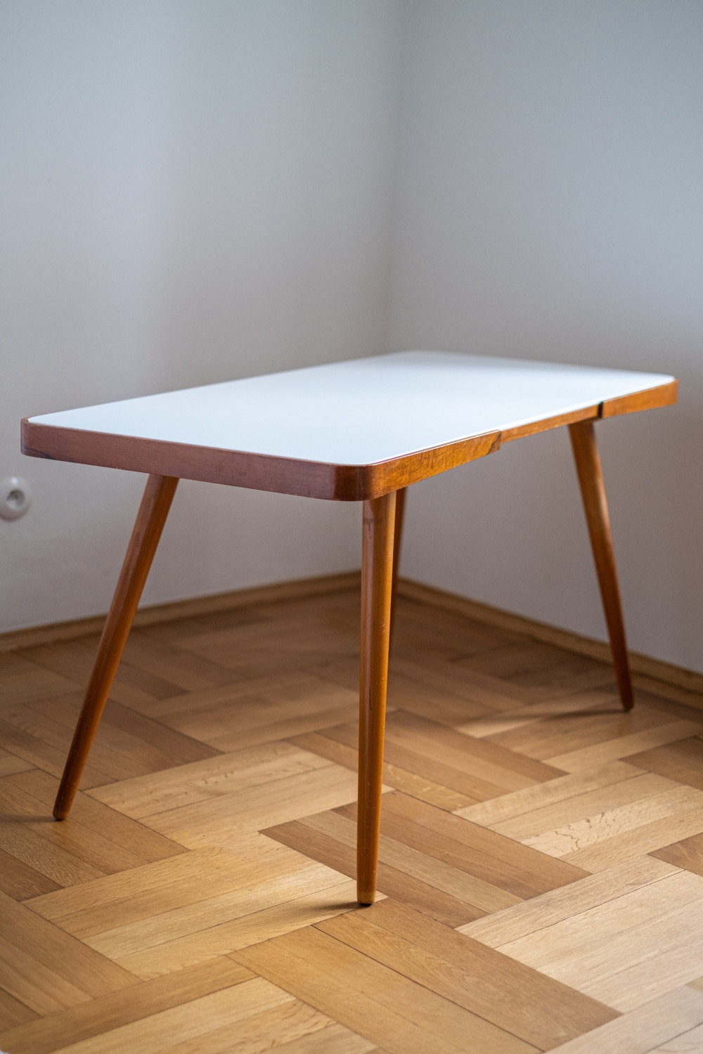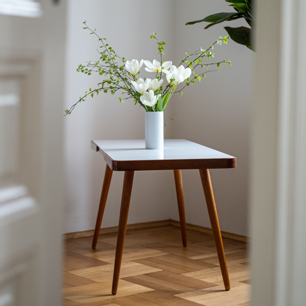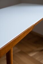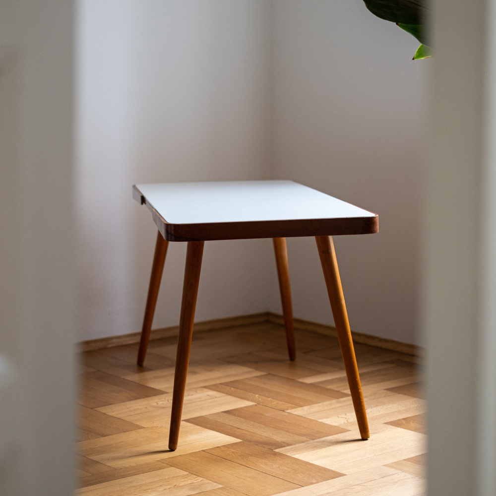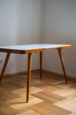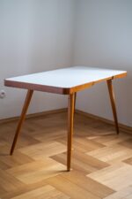 Konferenční stolek z 60. let 20. století, který je poslední dobou velmi oblíbený a stále stoupá na ceně. Byl vyrobený v podniku Interier Praha podle návrhu Jiřího Jiroutka a dělal se ve dvou variantach – s bílou nebo černou skleněnou opaxitovou deskou. Podnoží stolu je z masivního bukového dřeva. Skleněná deska je vyjimatelná, takže opatrně při manipulaci, ať vám nevypadne.
