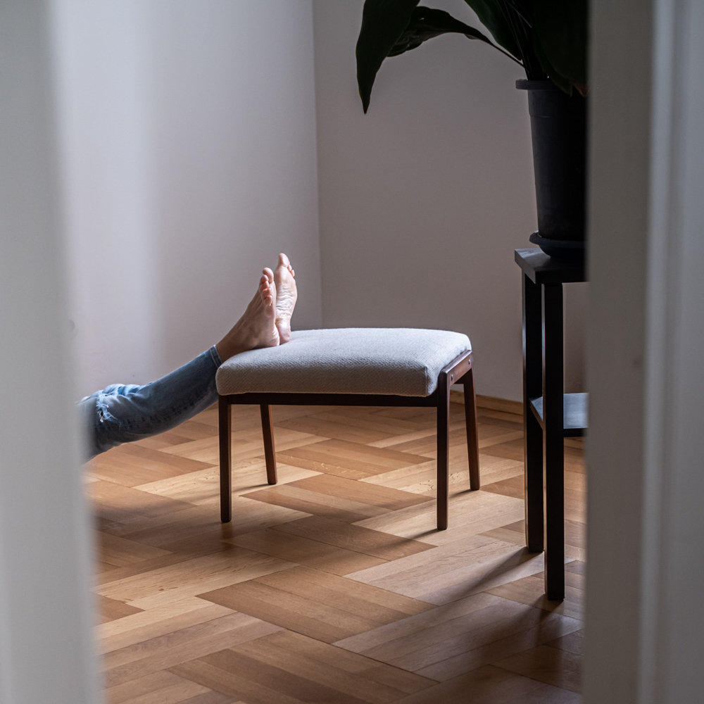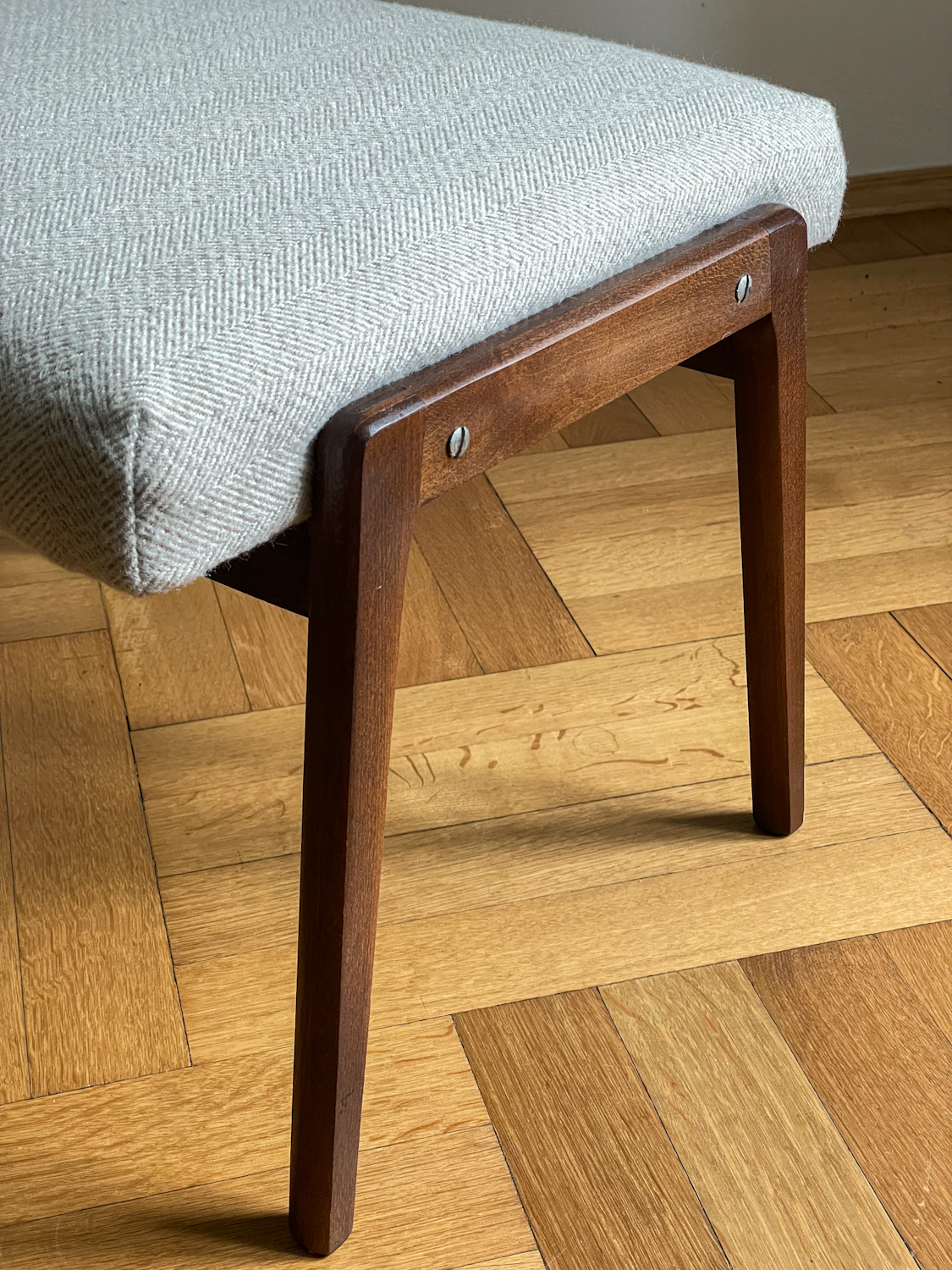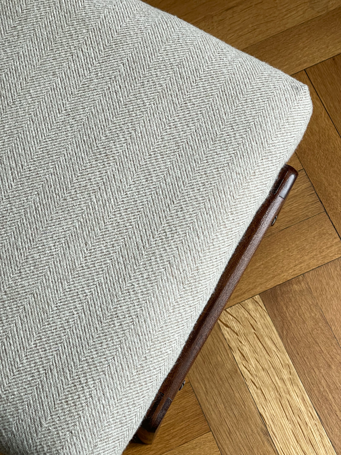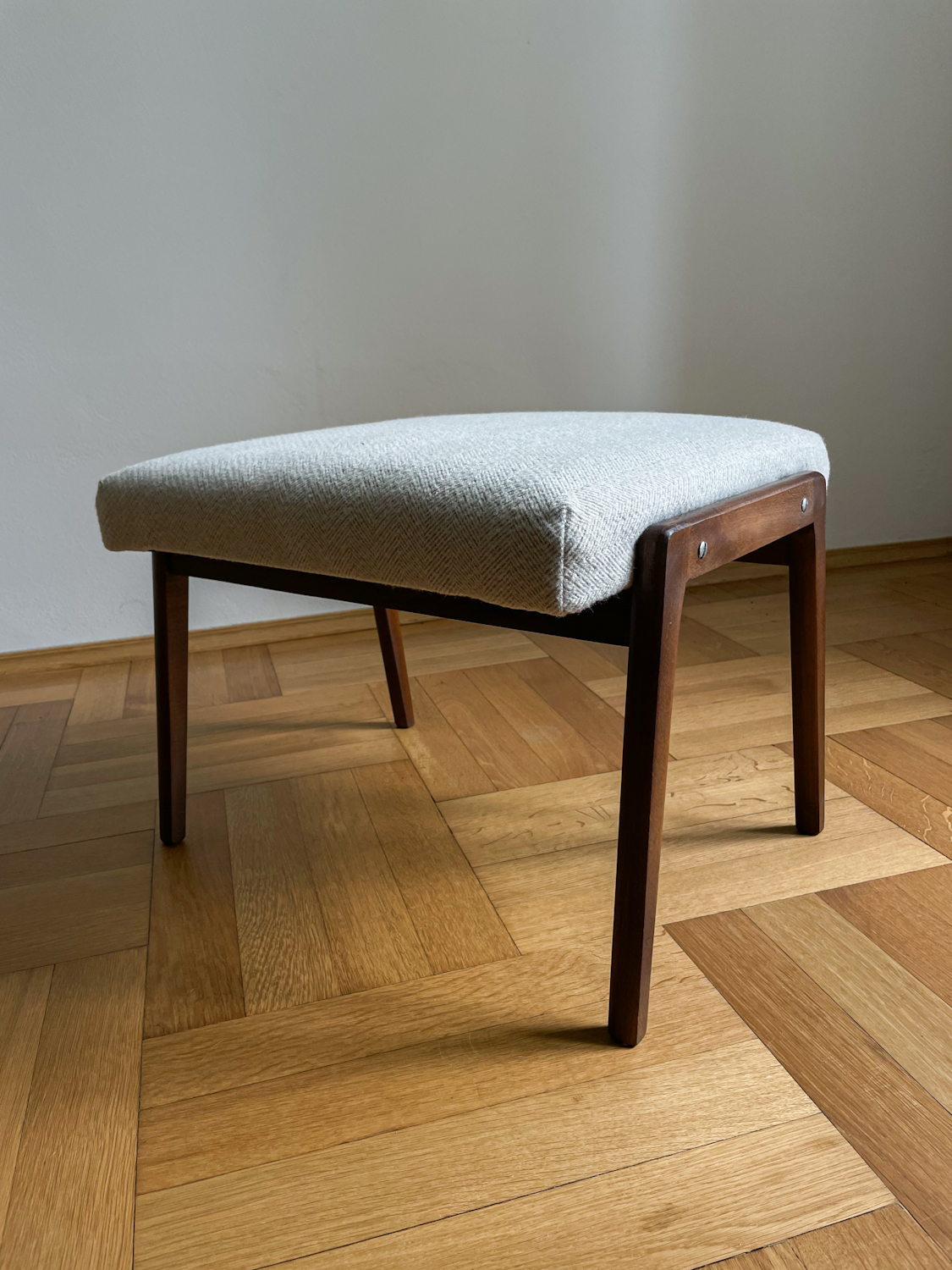 Jeden z nejžádanějších kousků nábytku je taburet, protože svým rozměrem zapadne i do menšího prostoru a krásně jej doplní. Tento je nově čalouněn v elegantní kohoutí stopě v béžové barvě.