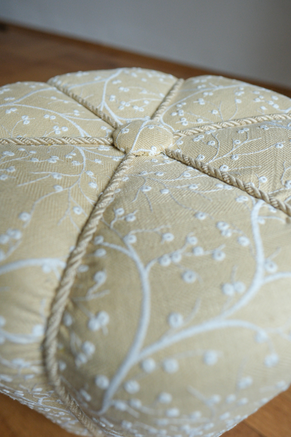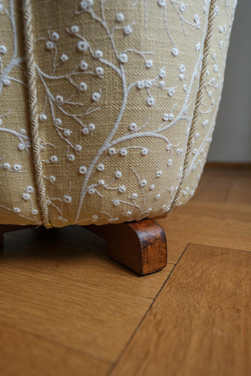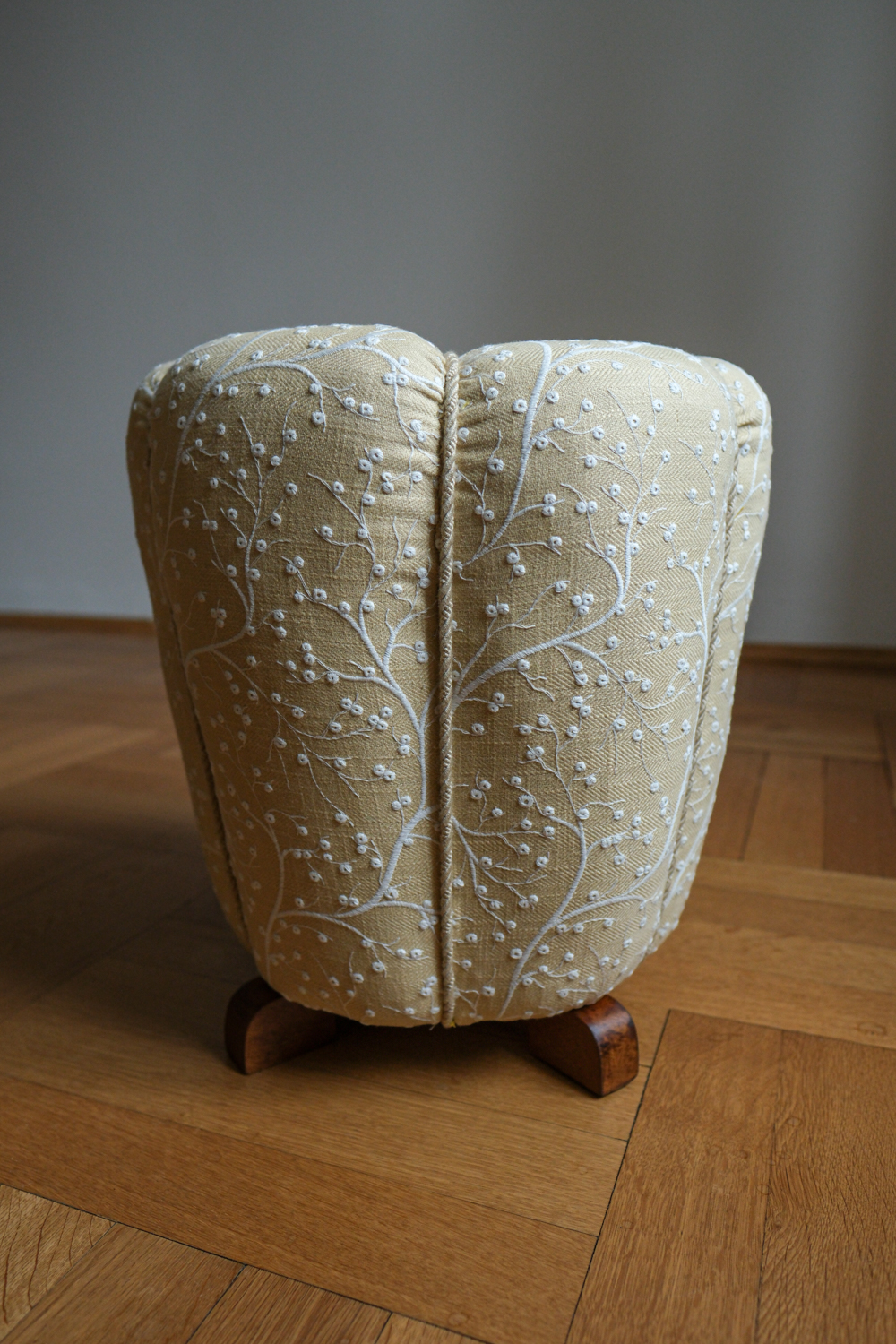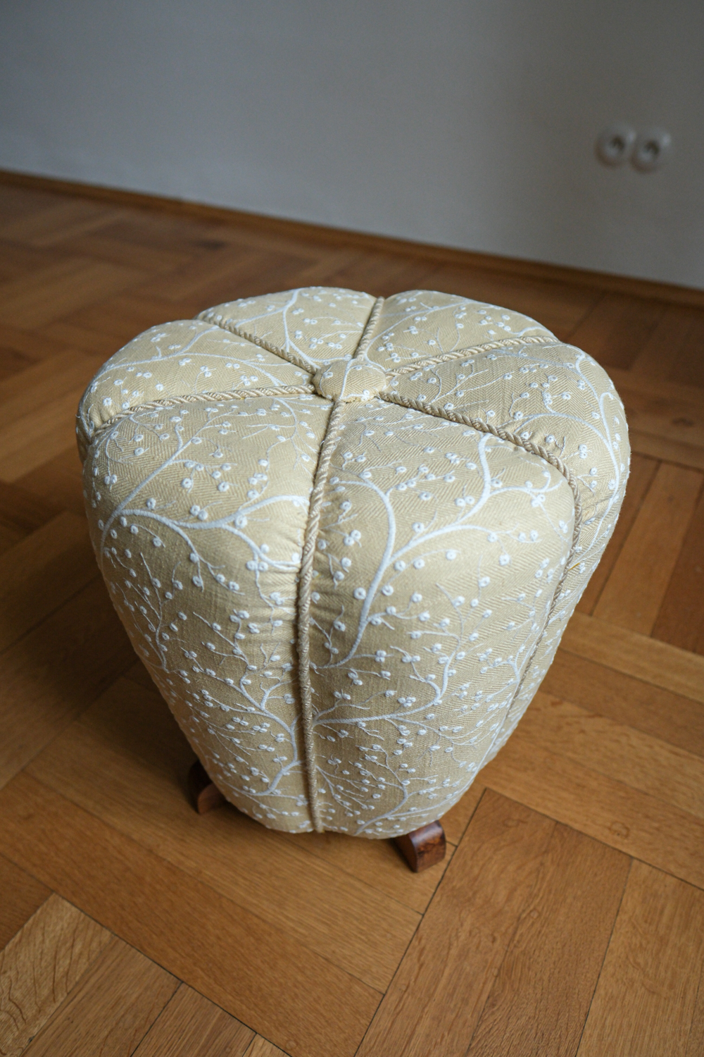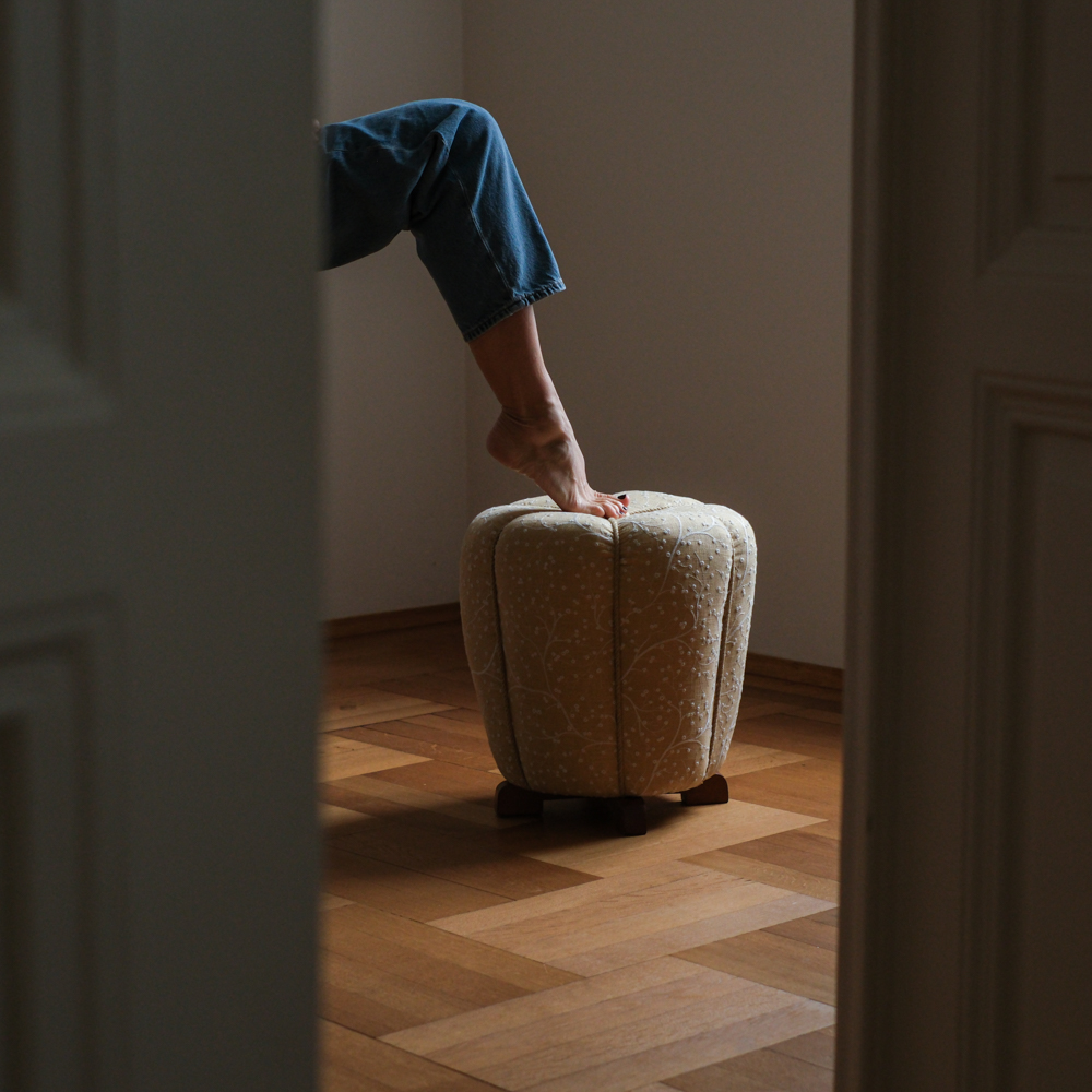 Taburet prošel kompletní renovací. Zvolili jsme látku s jemným botanickým motivem na vanilkovém podkladu, která podtrhuje něžný charakter tvaru a dodává mu lehce nostalgický, ale stále velmi čistý výraz.