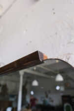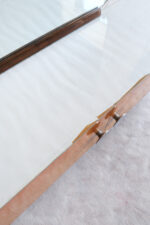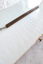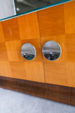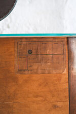 Toaletka z 50. let 20. století dle designu Jindřicha Halabaly, vyrobena v UP závodech. Přední část dvířek je intarzovaná do vzoru šachovnice. Uvnitř skříňky jsou dvě praktické poličky z ohýbané překližky. Na horní desce skříňky je čiré sklo podložené papírem. V tomto designu máme do kompletu i manželskou postel, menší šatní skříň, velkou šatní skříň a menší toaletní skříňku.