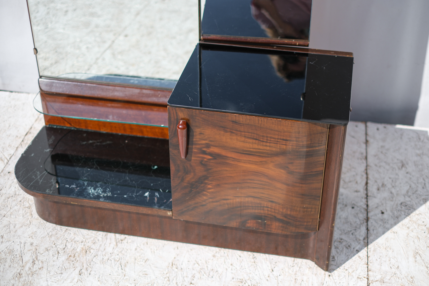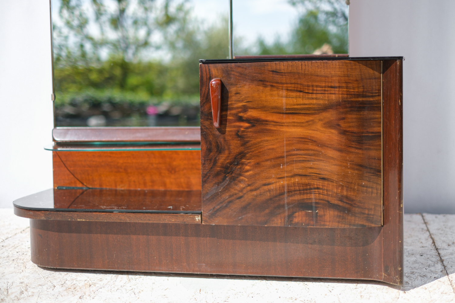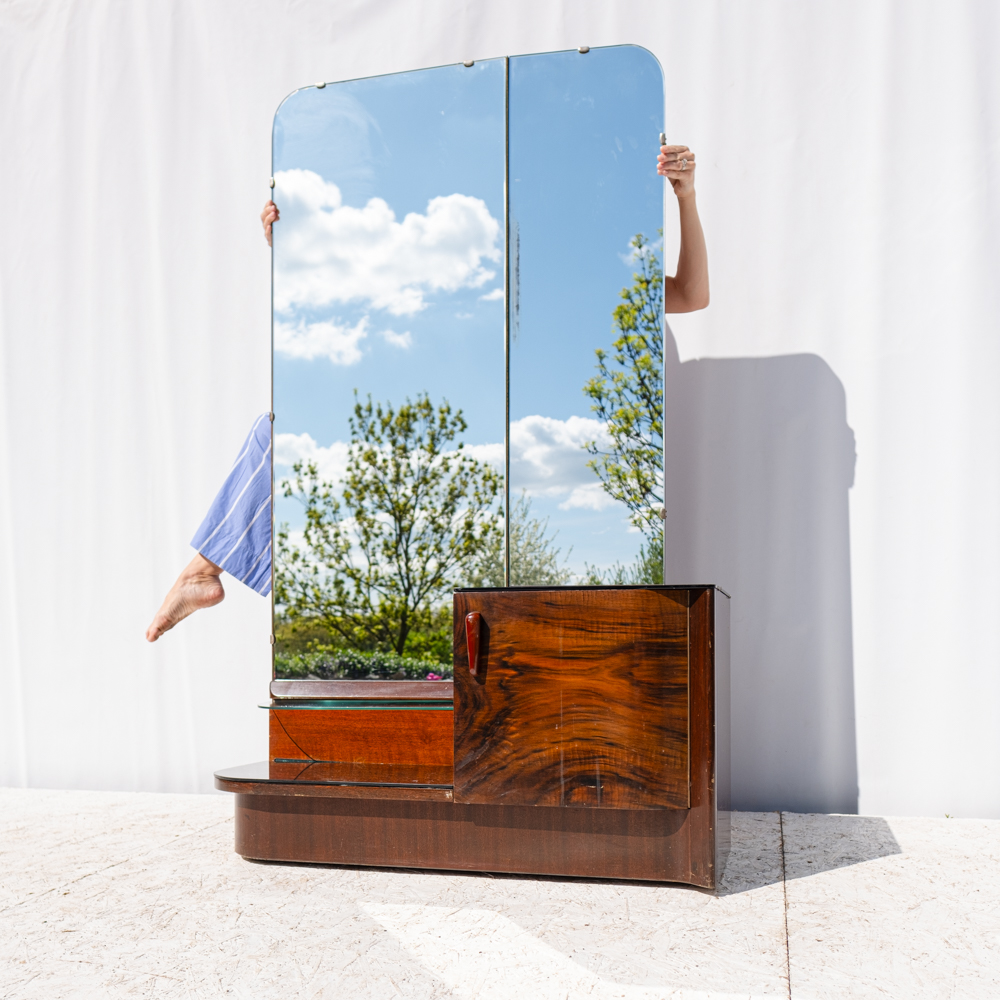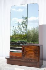 Elegantní toaletní skříňka s trojdílným zrcadlem pochází z dílny Interiér Praha, jednoho z předních československých nábytkových podniků poloviny 20. století. Tělo skříňky je zhotoveno z dýhovaného dřeva s bohatou kresbou. Zaoblené tvary, bakelitová úchytka a praktický úložný prostor dělají z tohoto kusu nadčasový solitér do ložnice nebo předsíně.