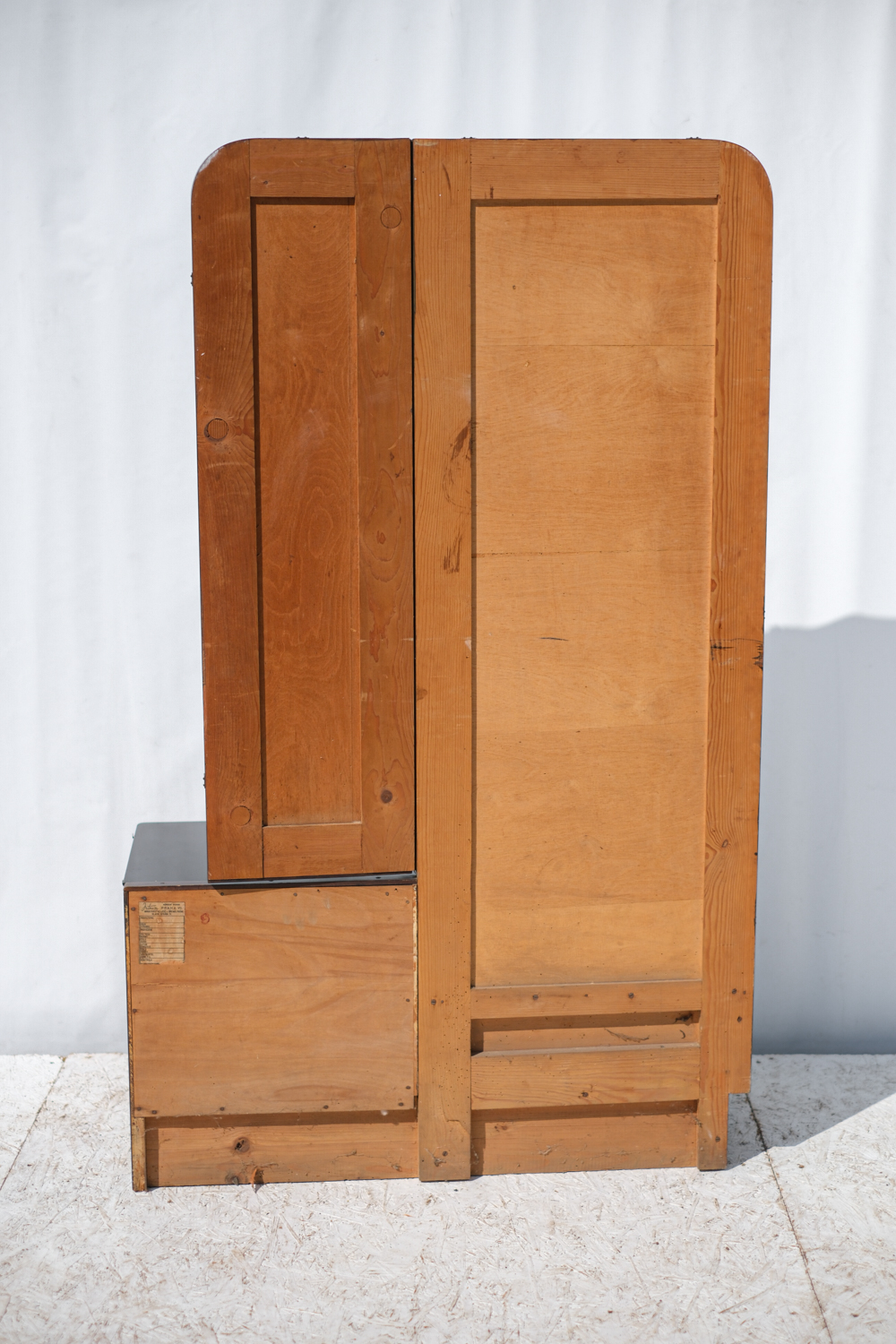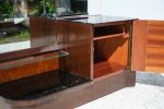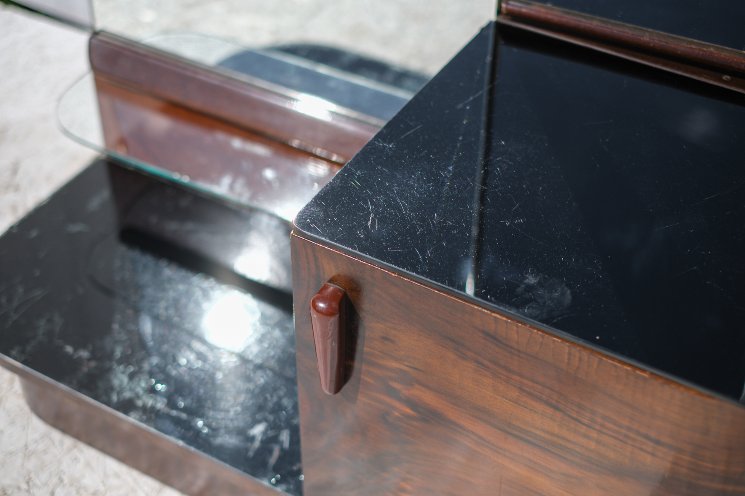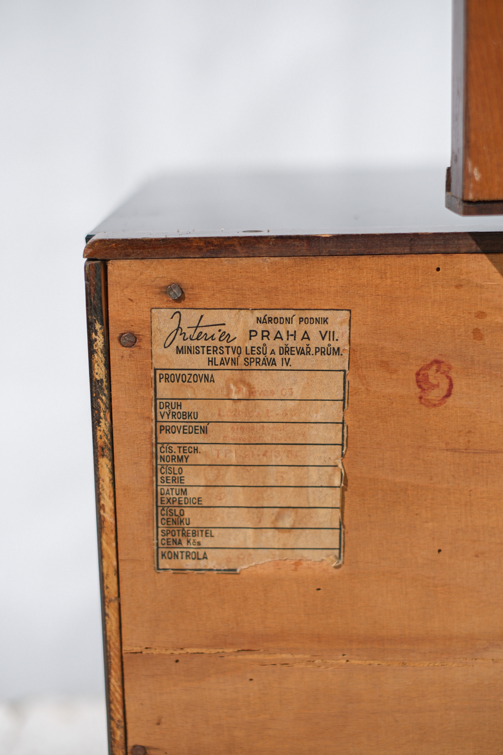 Elegantní toaletní skříňka s trojdílným zrcadlem pochází z dílny Interiér Praha, jednoho z předních československých nábytkových podniků poloviny 20. století. Tělo skříňky je zhotoveno z dýhovaného dřeva s bohatou kresbou. Zaoblené tvary, bakelitová úchytka a praktický úložný prostor dělají z tohoto kusu nadčasový solitér do ložnice nebo předsíně.