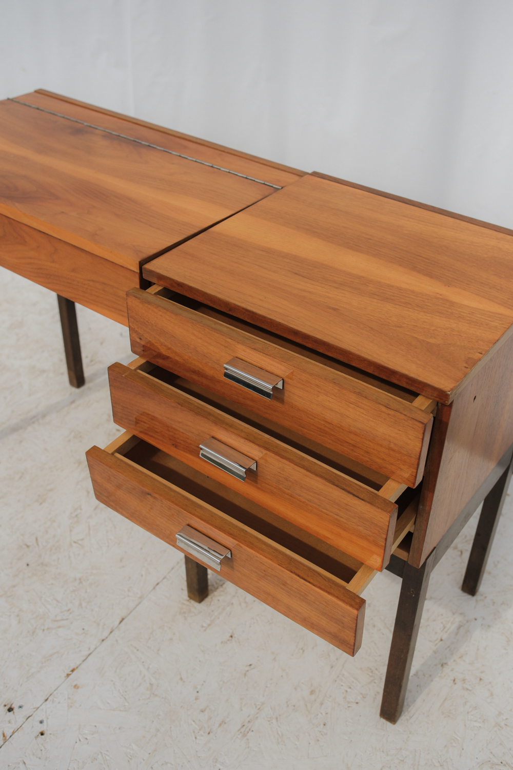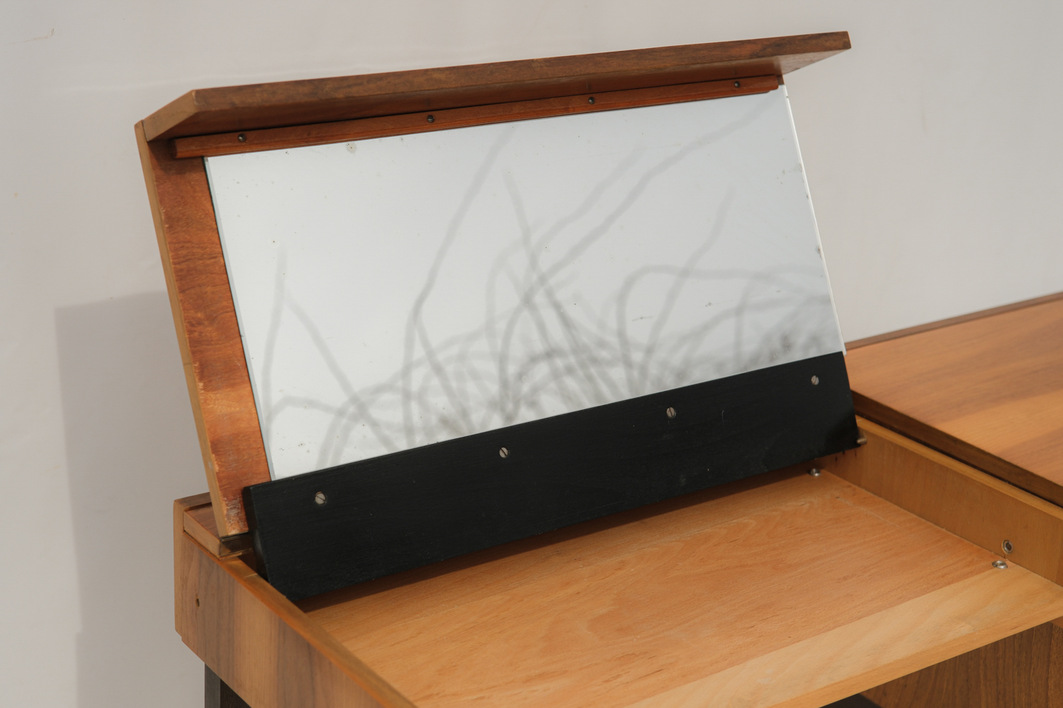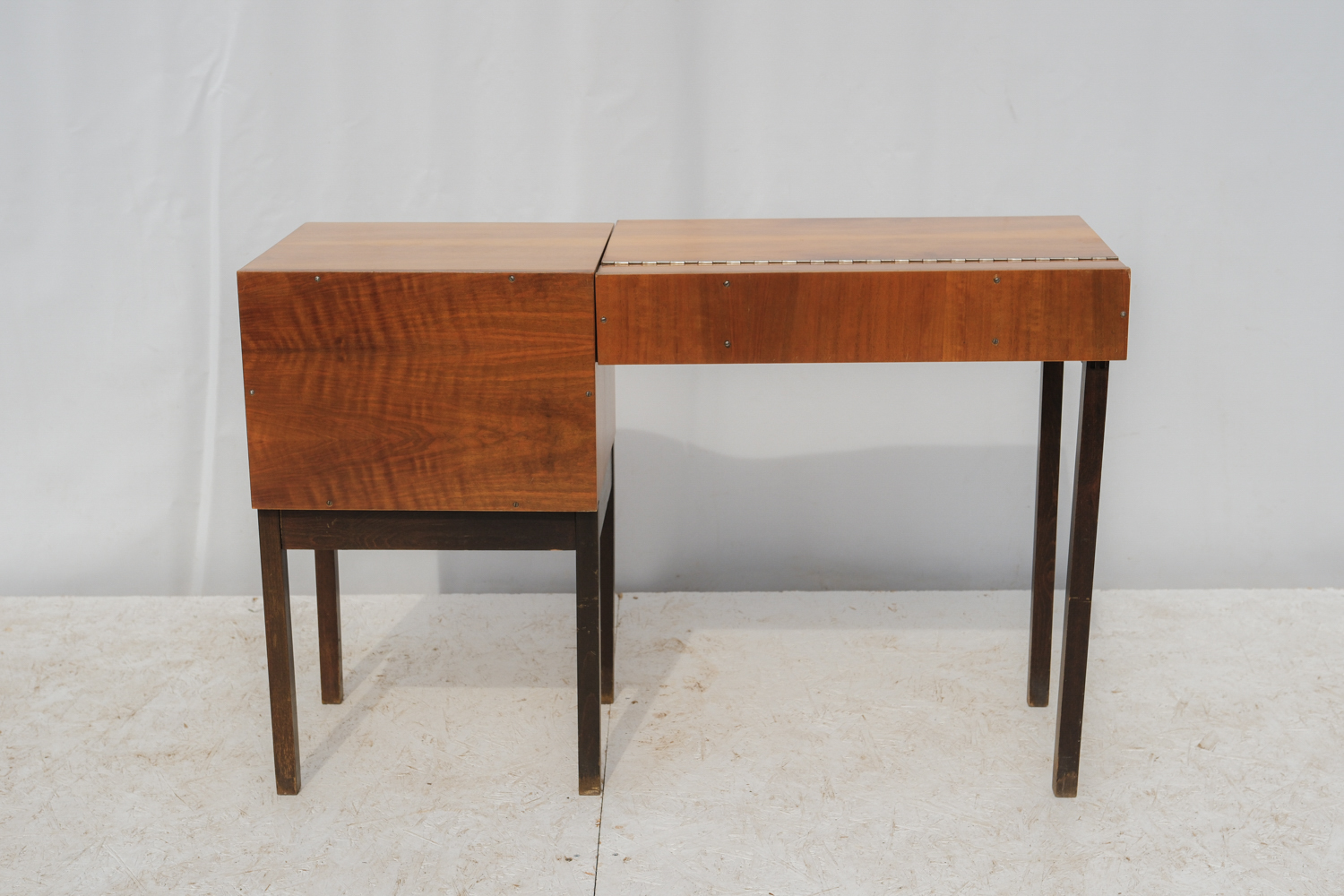 Model z produkce UP závodů Bučovice, typický pro československý design 60. let, kde se kladl důraz na funkčnost, variabilitu a úspornou eleganci. Subtilní konstrukce na štíhlých nohách působí lehce, zatímco kontrast dvou tónů dřeva dodává celku hloubku.