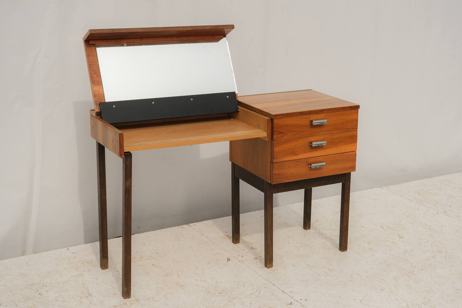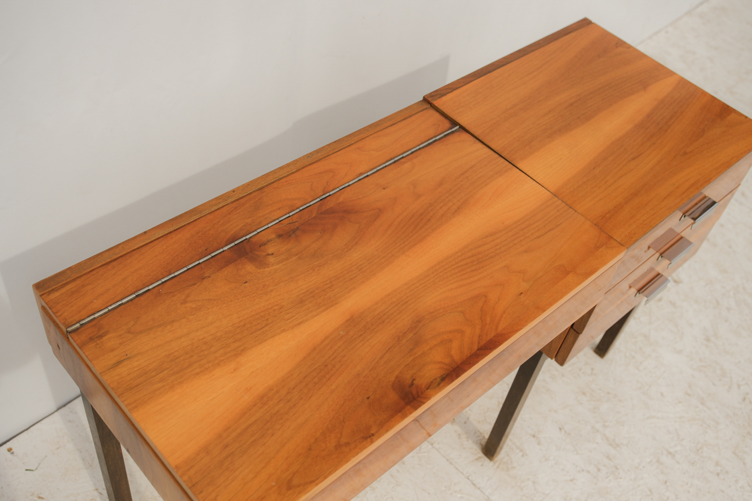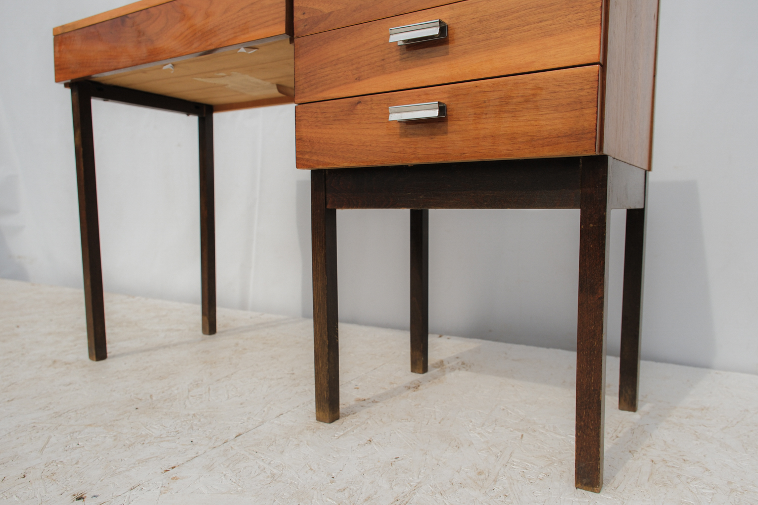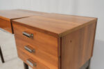 Model z produkce UP závodů Bučovice, typický pro československý design 60. let, kde se kladl důraz na funkčnost, variabilitu a úspornou eleganci. Subtilní konstrukce na štíhlých nohách působí lehce, zatímco kontrast dvou tónů dřeva dodává celku hloubku.