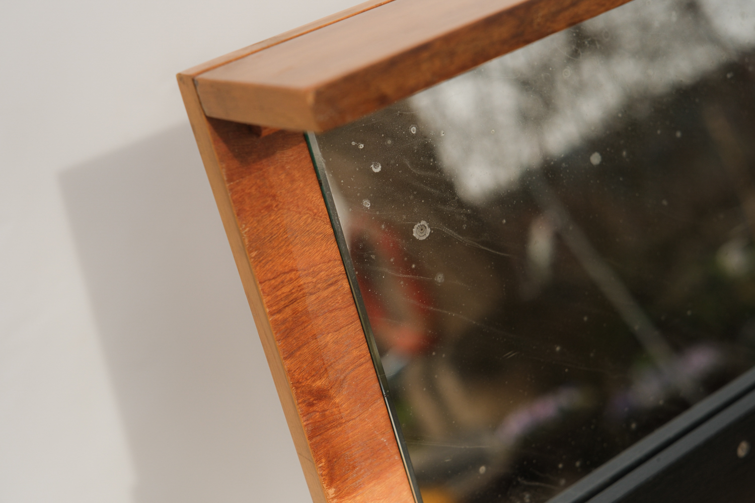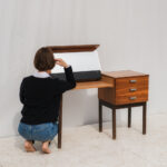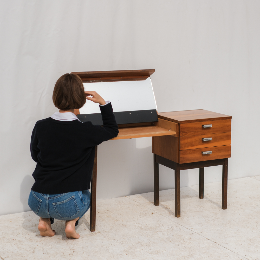 Na první pohled střídmý stolek s čistou linií, který v sobě skrývá víc, než se zdá. Stačí odklopit horní desku a jednoduchý solitér se promění v osobní prostor se zrcadlem a praktickým úložným zázemím.