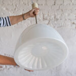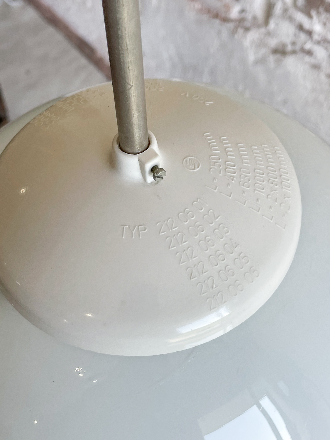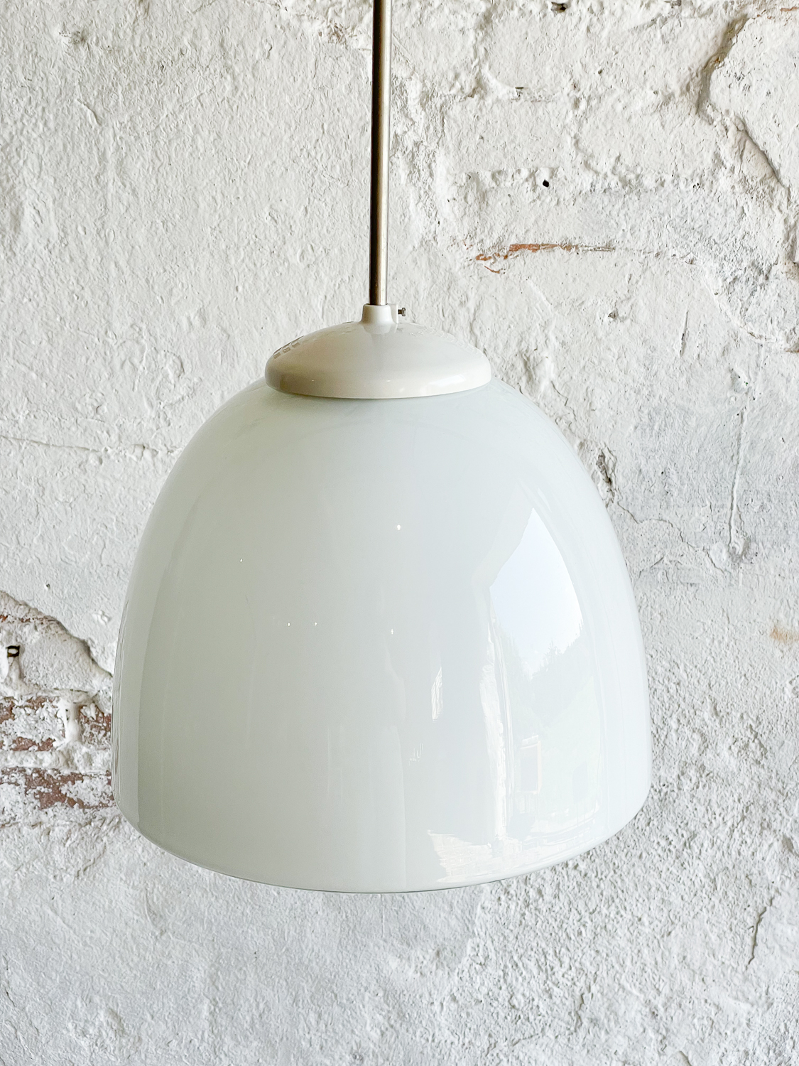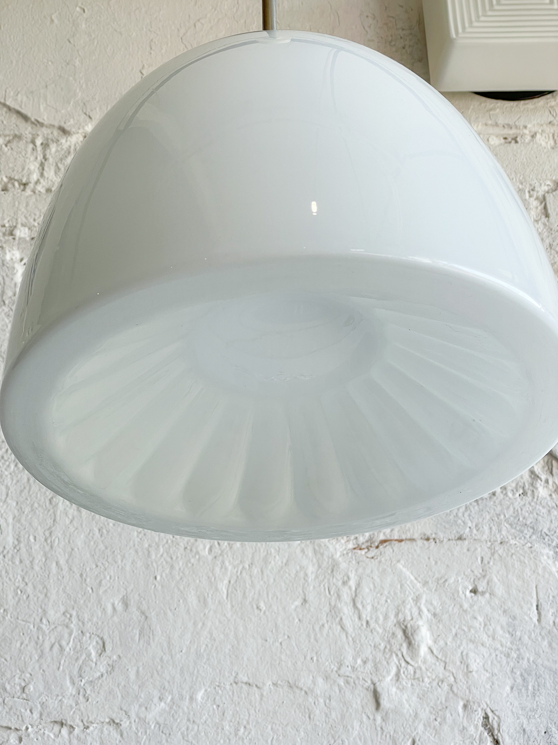 Velký lustr z opálového skla ve tvaru zvonu a při pohledu zespodu můžeme vidět slunce nebo kopretinu.