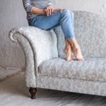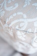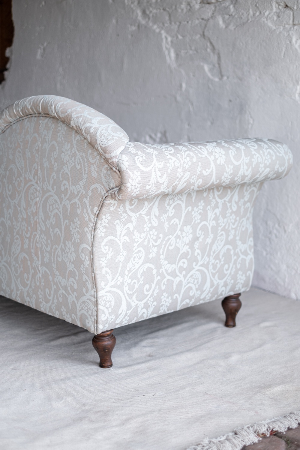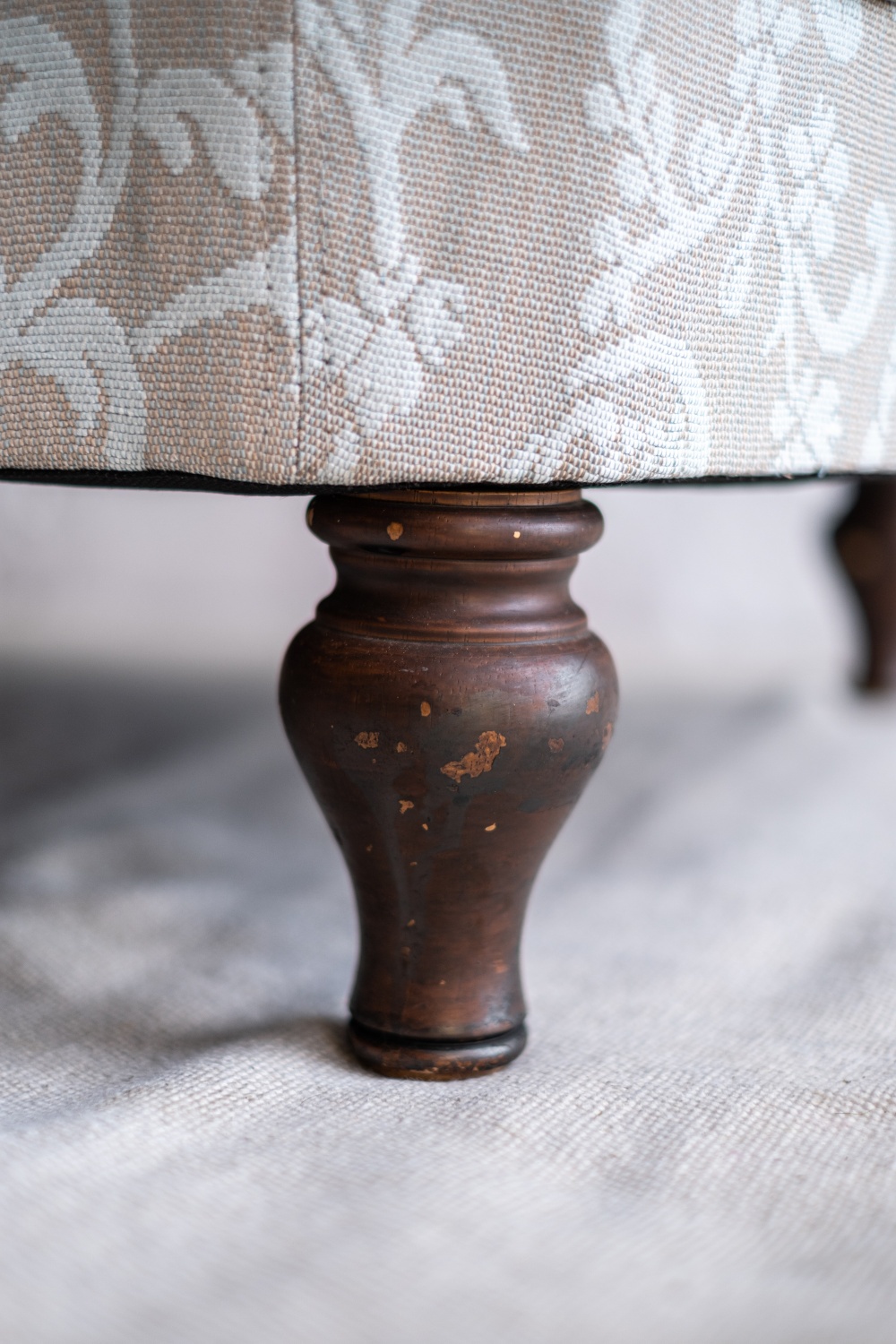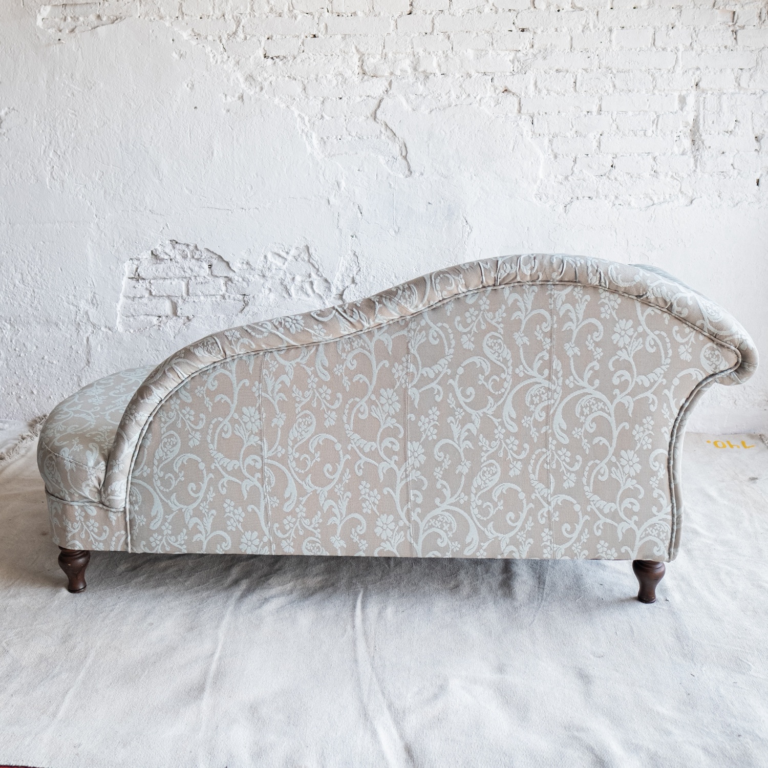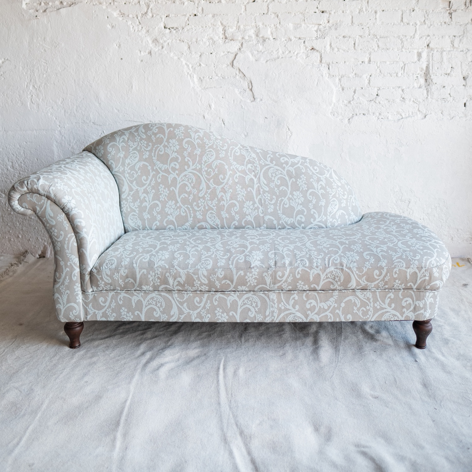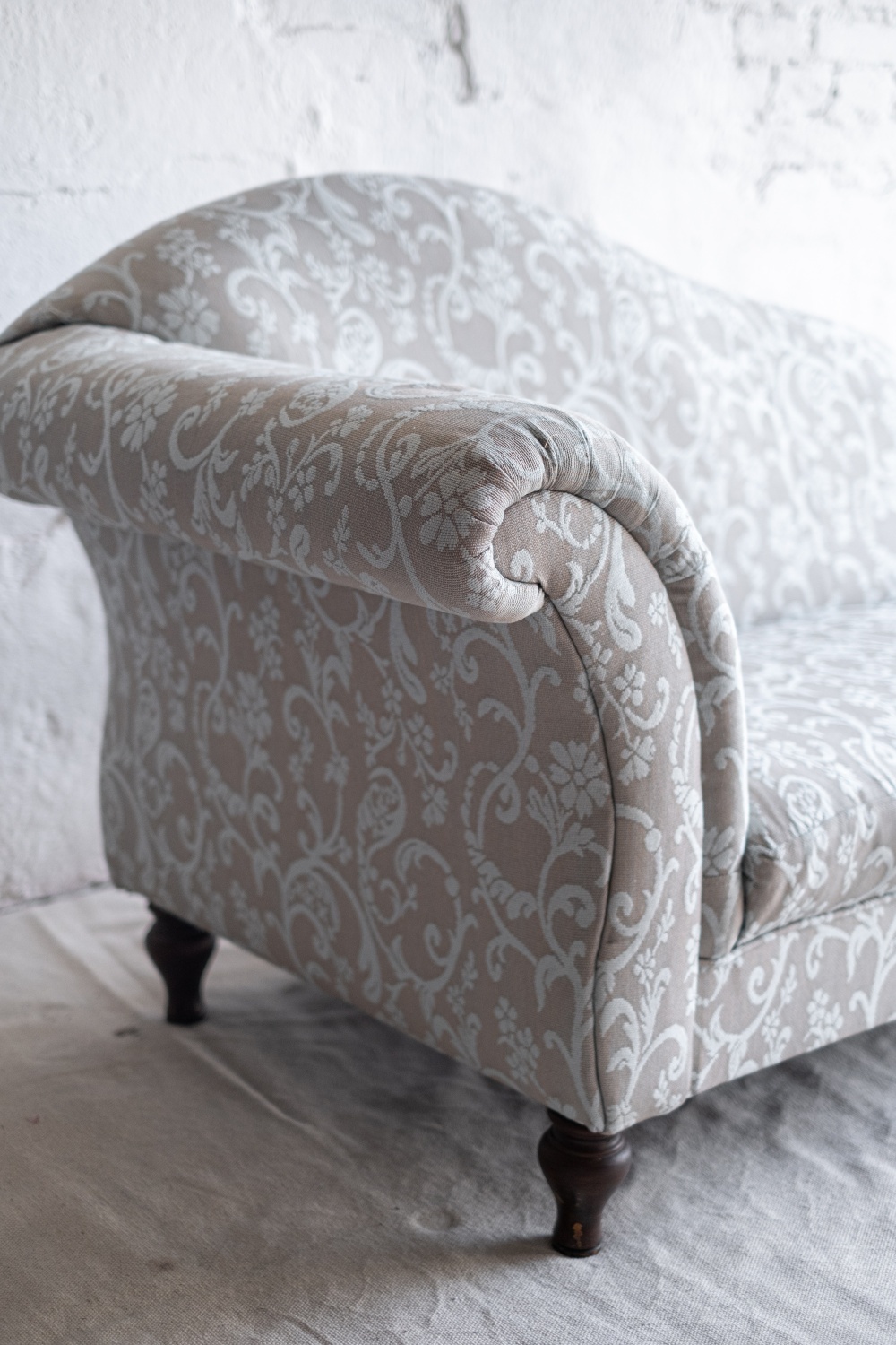 Lenoška v zámeckém stylu zachráněna ze secesní vily v Dobříši. Nově čalouněná v decentní kombinaci bleděmodré s béžovou.
