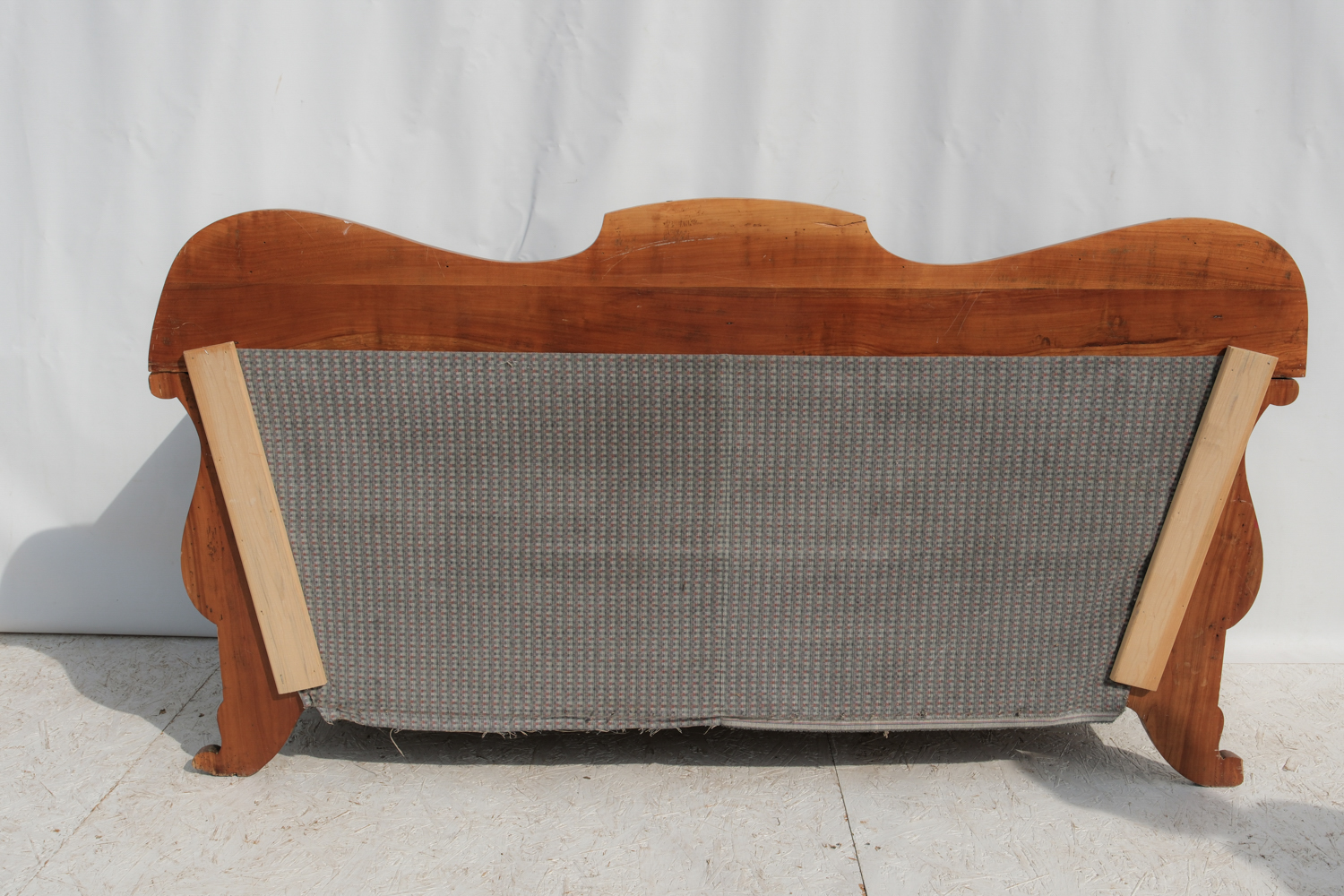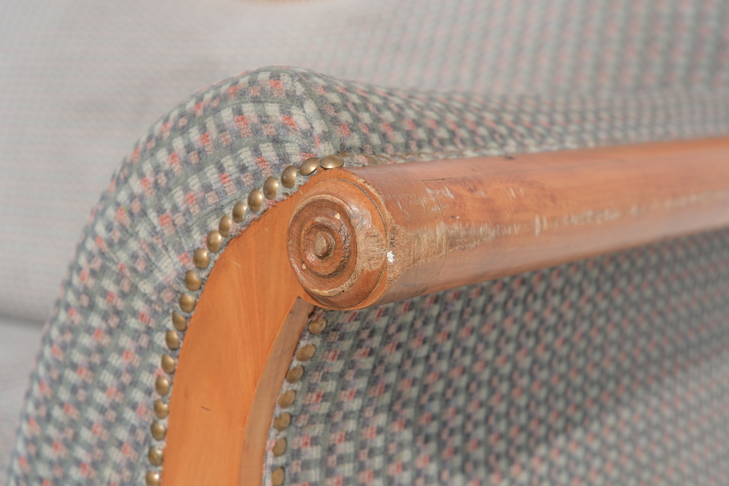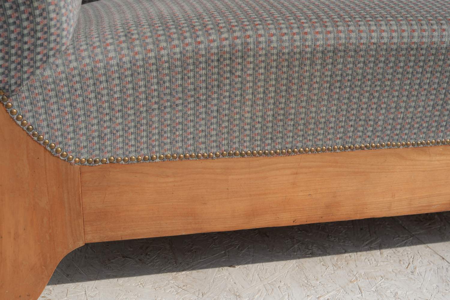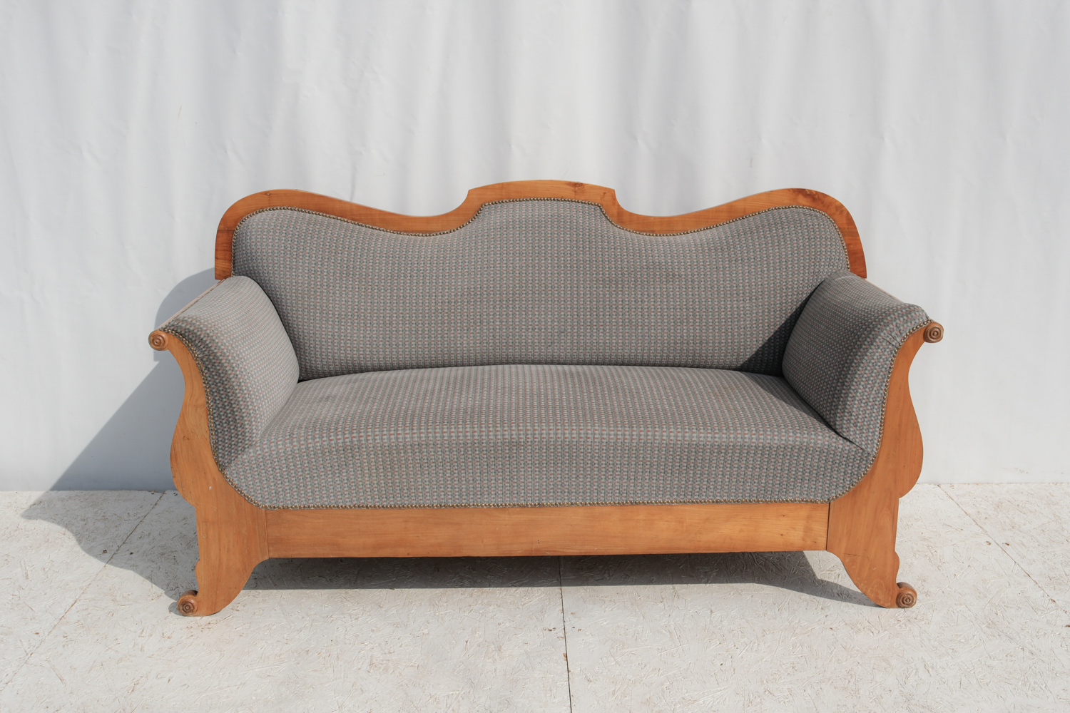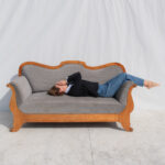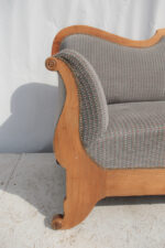 Pohovka z první poloviny 20. století nese výrazné znaky pozdního art deca s jemným přesahem k tradičnějšímu, téměř empírovému tvaru. Na první pohled zaujme elegantní siluetou – zvlněná horní hrana opěradla, plynule navazující područky a charakteristicky prohnuté bočnice vytvářejí celek, který působí měkce a zároveň velmi dekorativně. Díky své výrazné siluetě funguje dnes především jako solitér. V interiéru vytváří výrazný, téměř scénografický prvek.