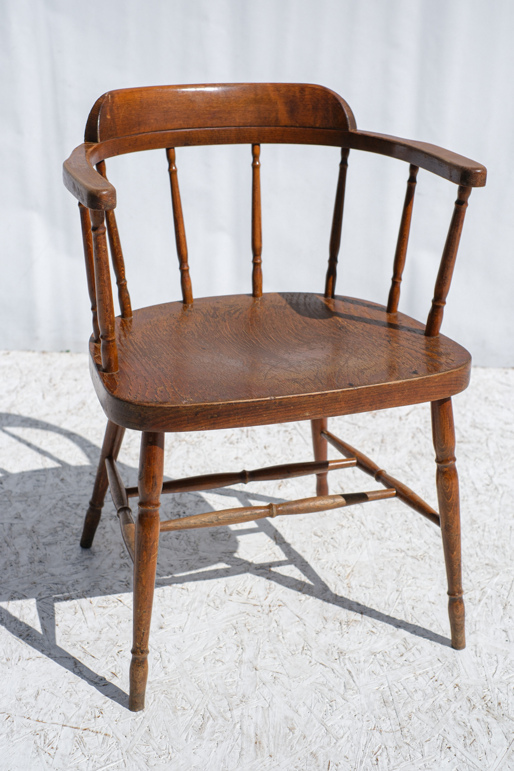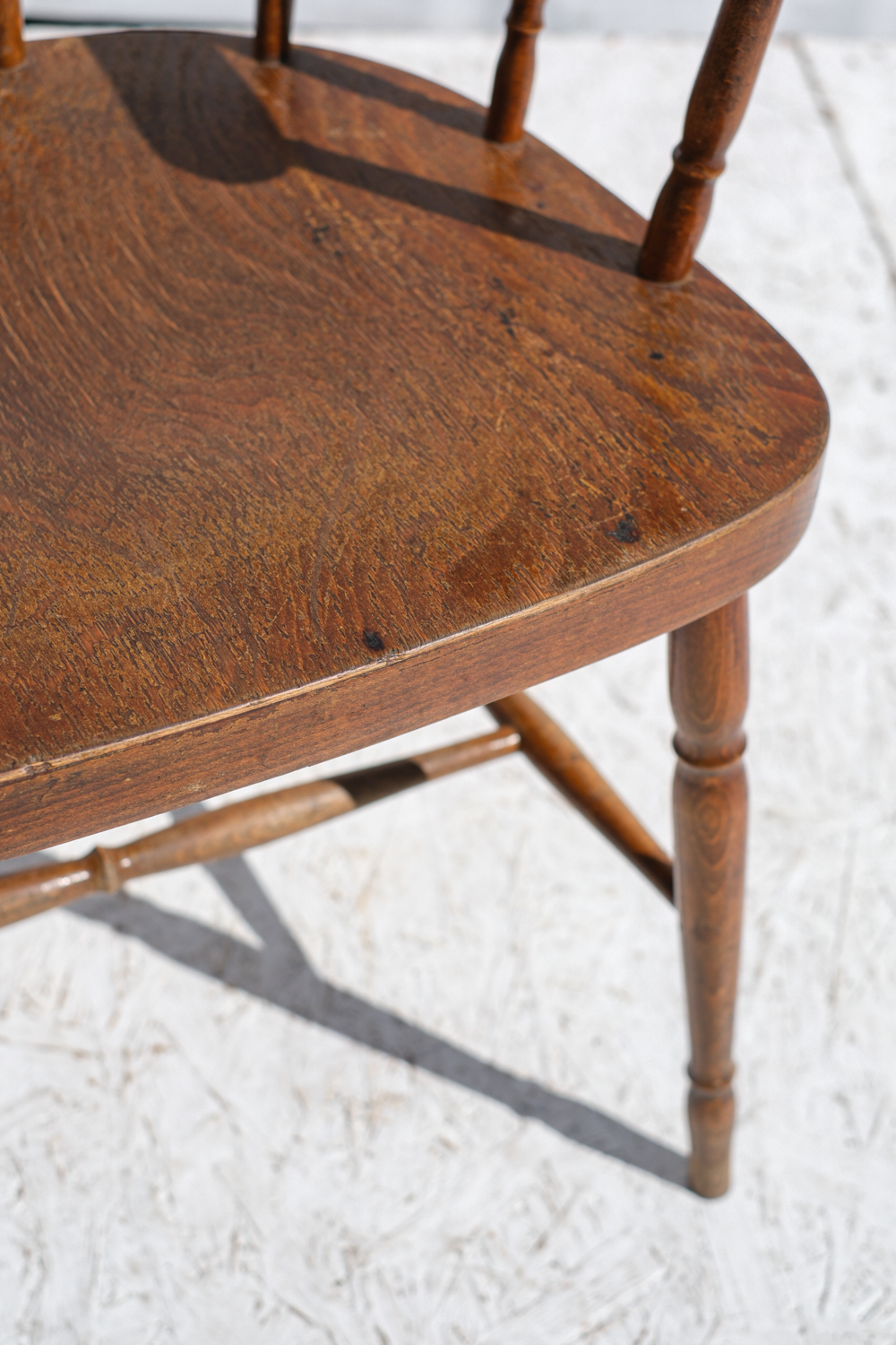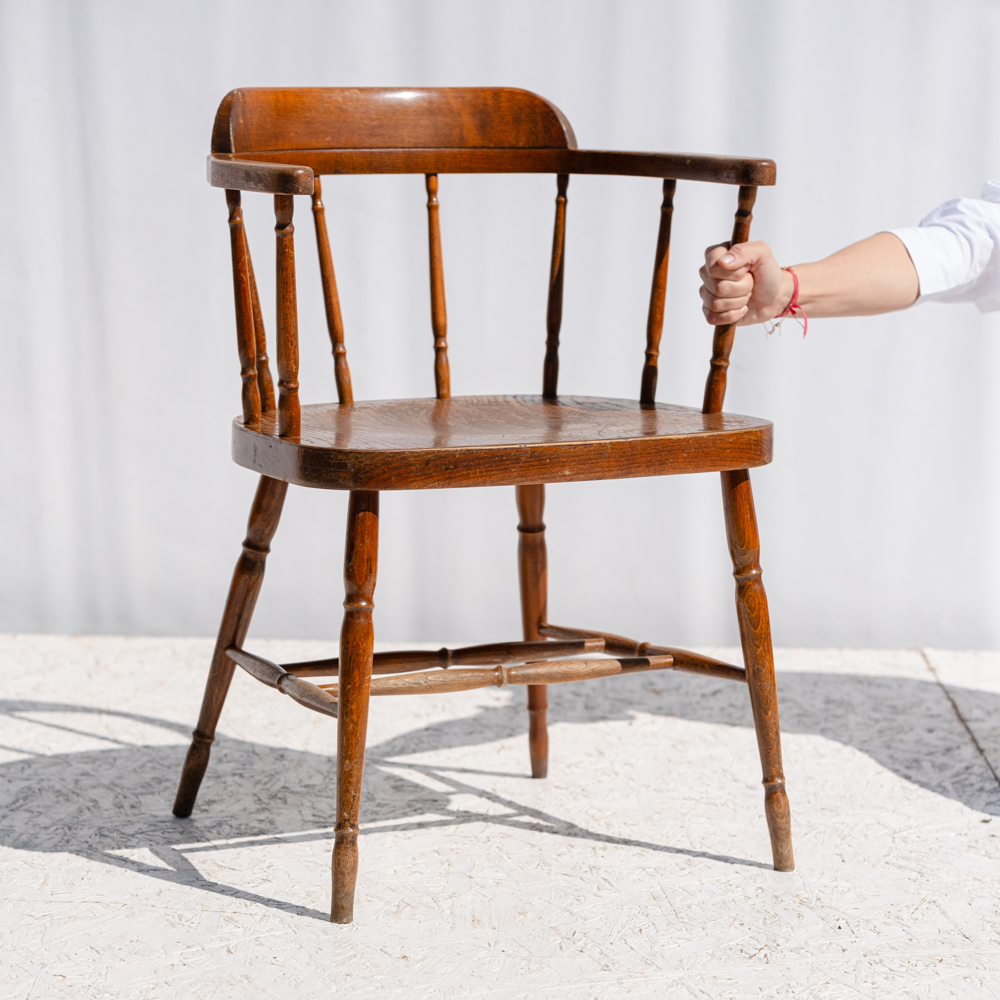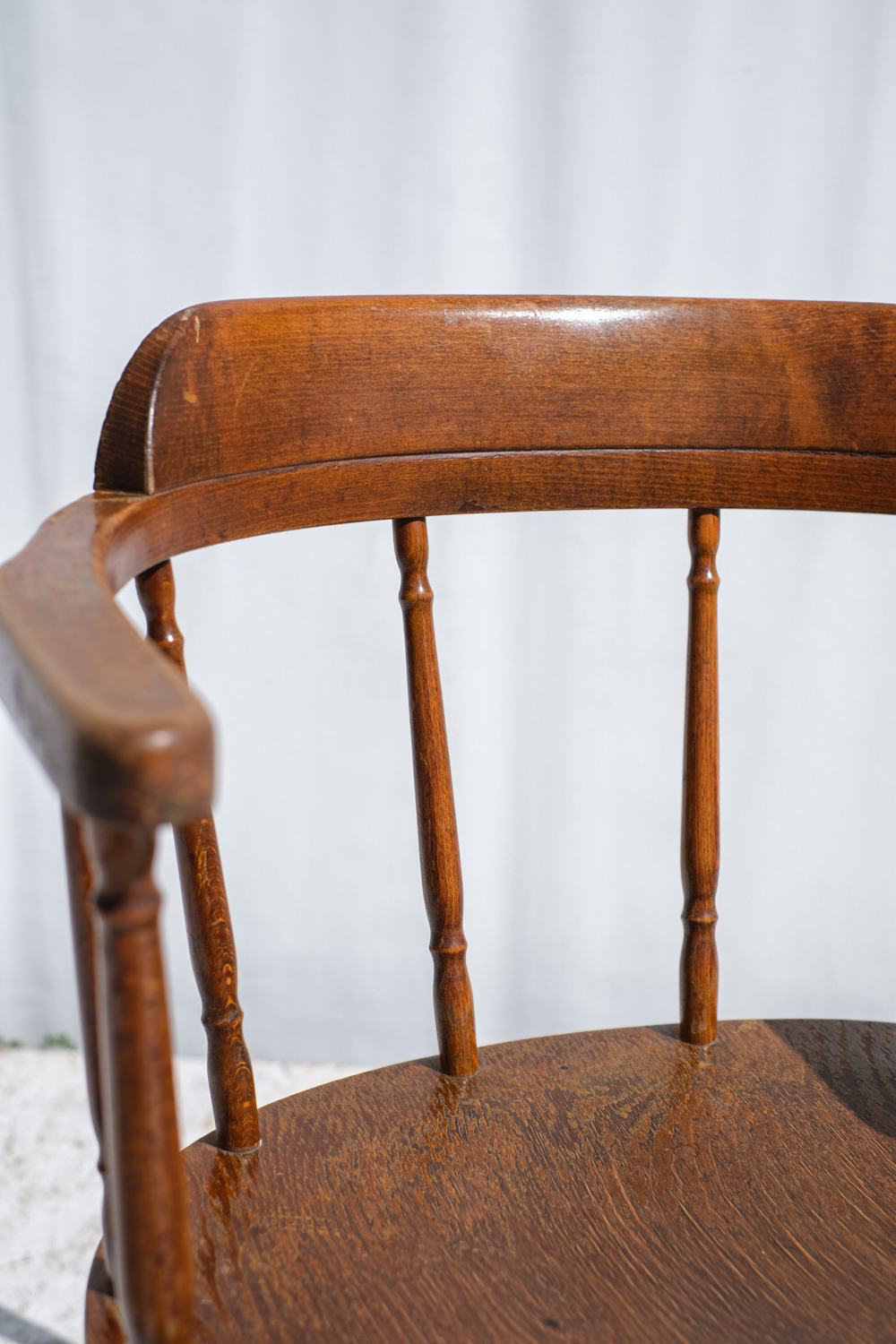 Tradiční dřevěná židle s područkami vyrobena z masivního dubu, s krásně patinovaným povrchem a řemeslným detailem. Tvar i proporce připomínají model Windsor z katalogů Thonet z přelomu 19. a 20. století.