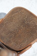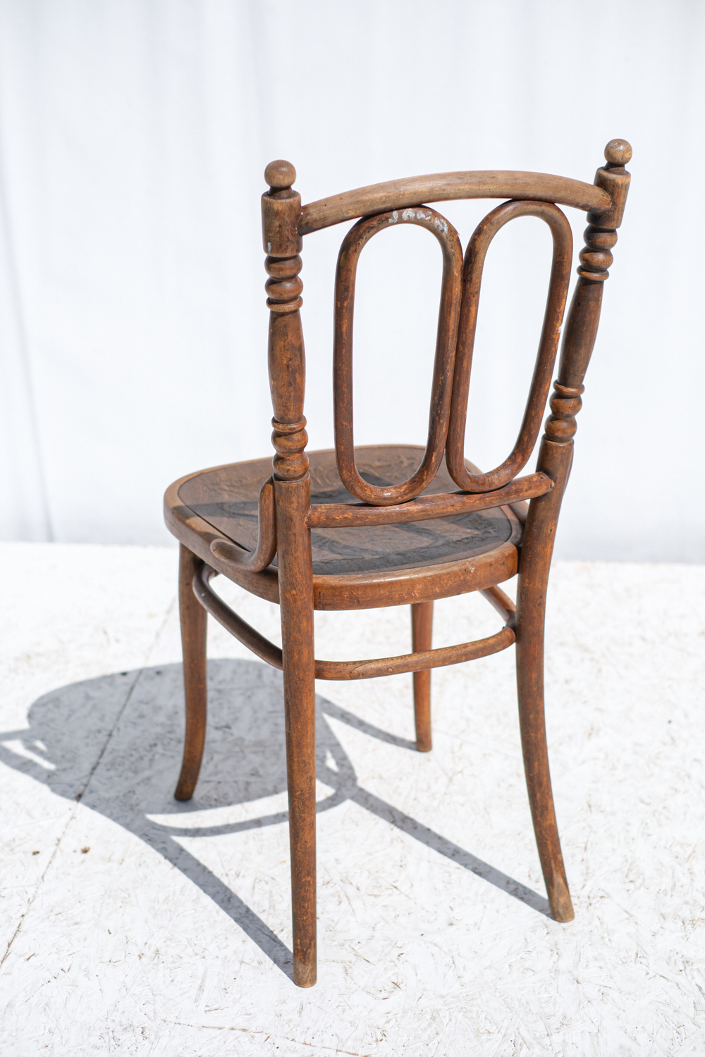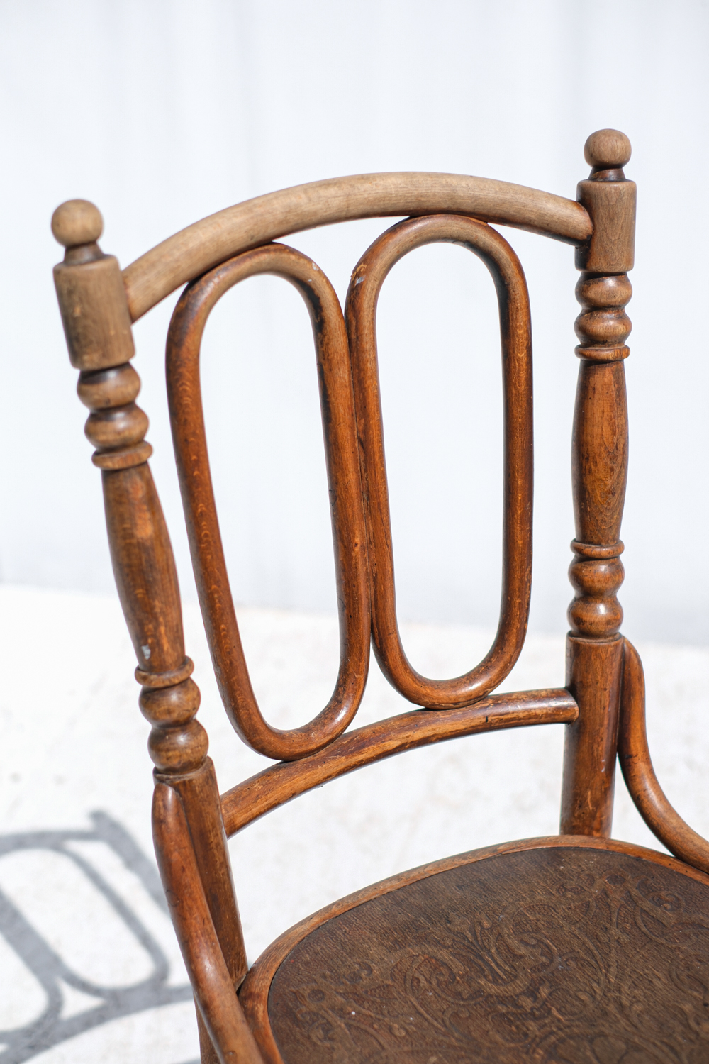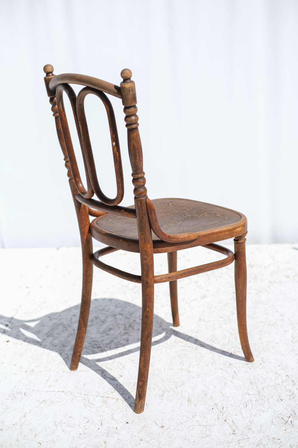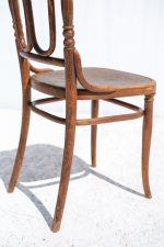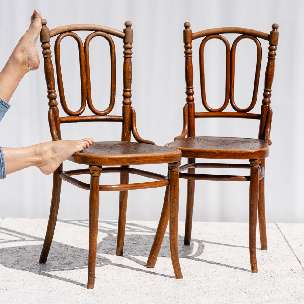 Elegantní dvojice málo výdaných židlí z ohýbaného dřeva od značky Thonet, vyrobená kolem roku 1900. Typická jsou výrazná oválná pole v opěradle, jemně soustružené prvky a zdobené lisované sedáky s florálním motivem.