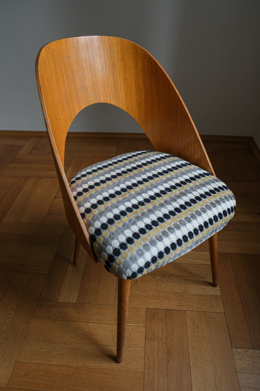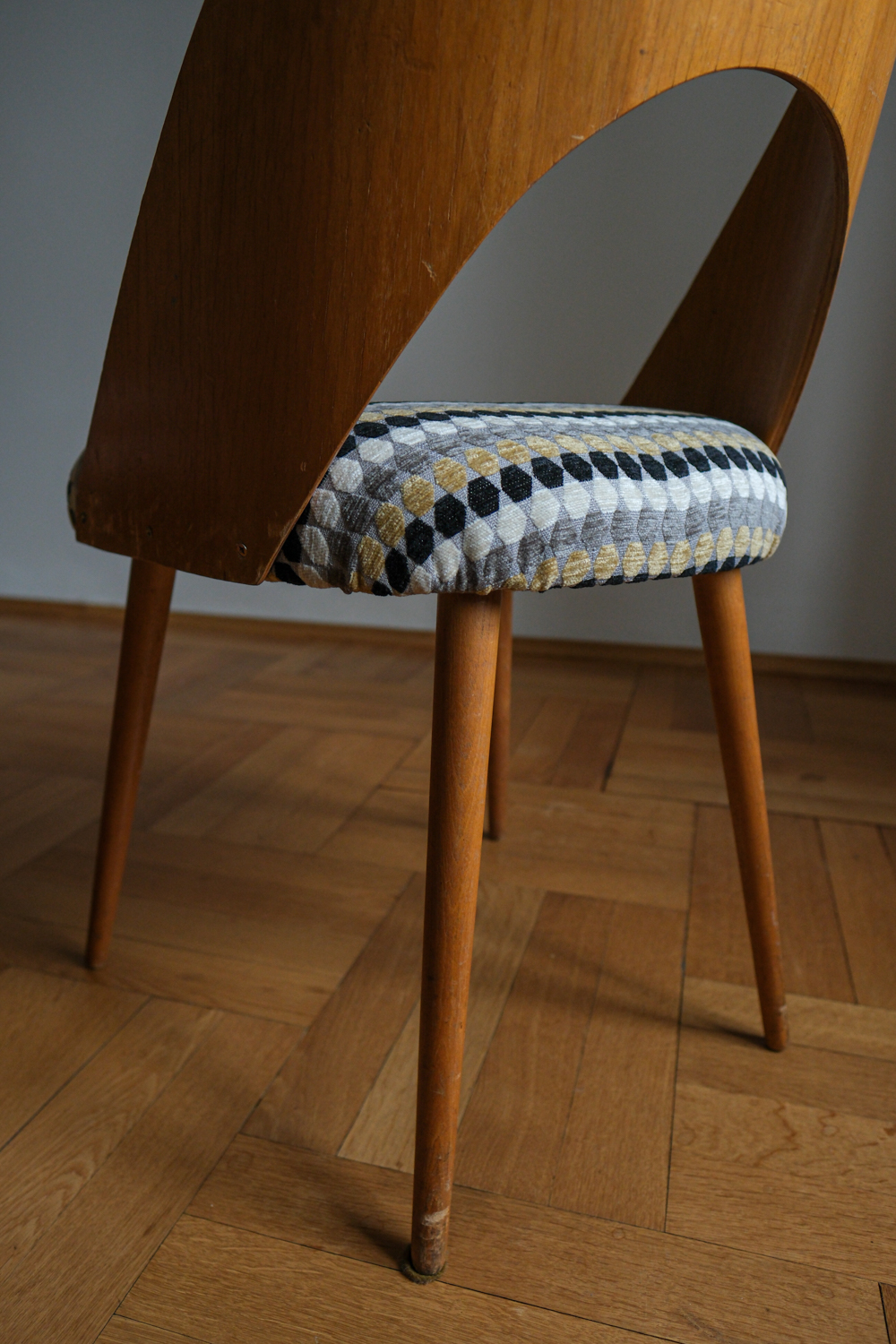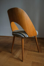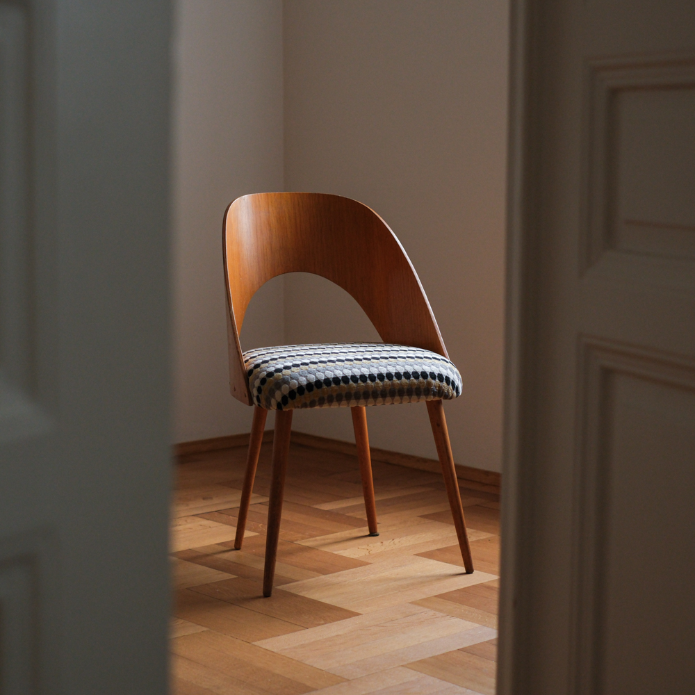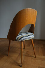 Tvar opěrky působí téměř organicky – jemně obklopuje záda, ale přitom zůstává subtilní. Sedák jsme nově očalounili do geometrické látky, která krásně oživuje přírodní tón dřeva a dodává židli hravý, přesto elegantní rytmus. Dřevěné části jsou v původním stavu, s přirozenou patinou, která k jejímu věku patří. Výsledkem je židle, která kombinuje modernistickou čistotu, pohodlnou ergonomii a výrazný podpis autora.