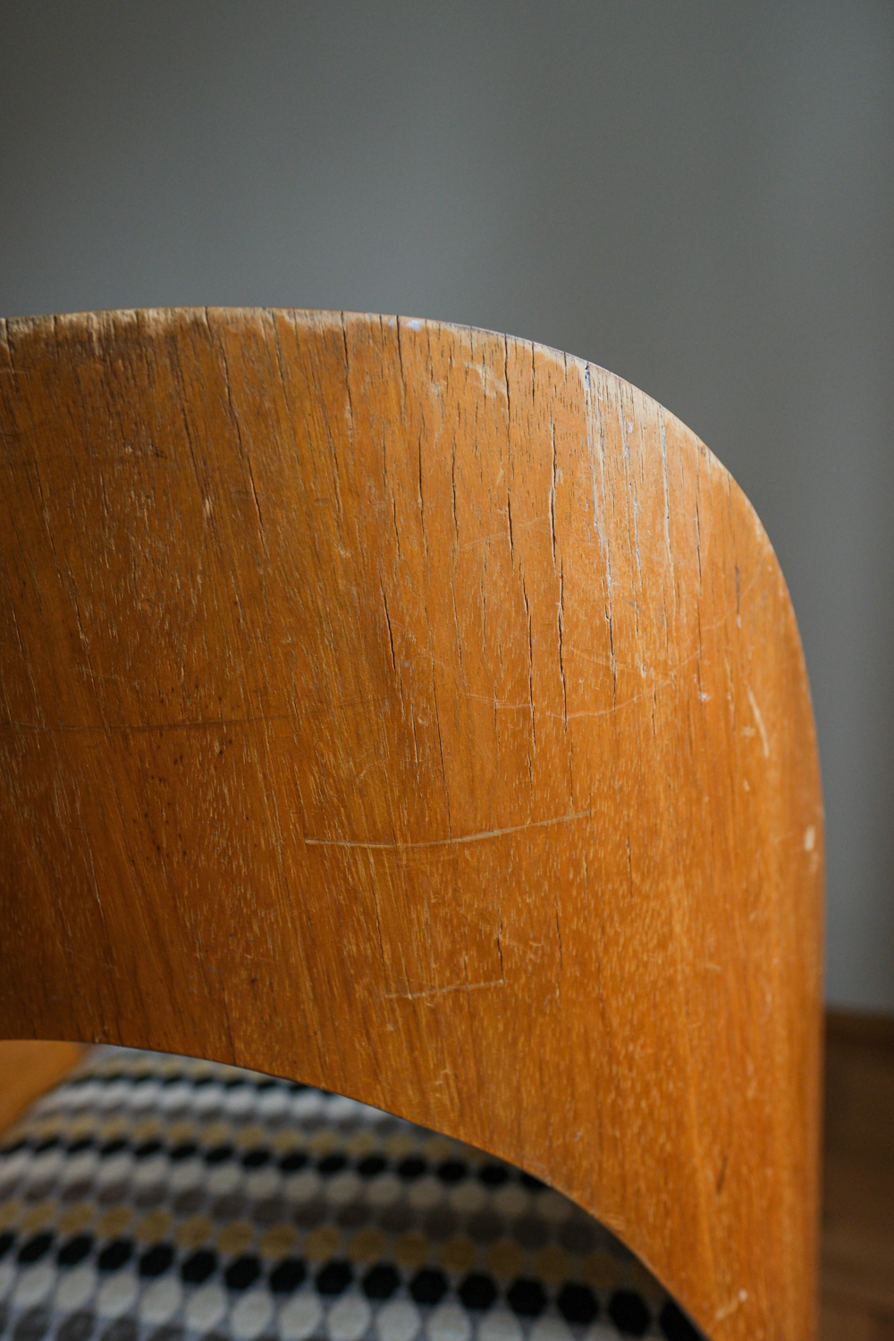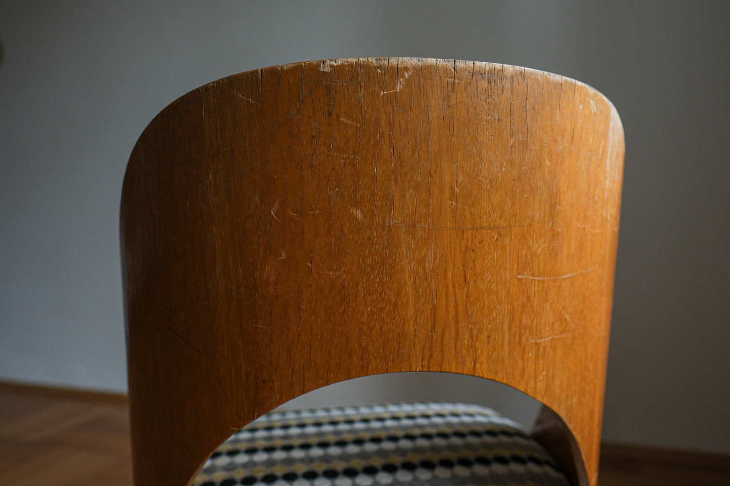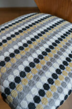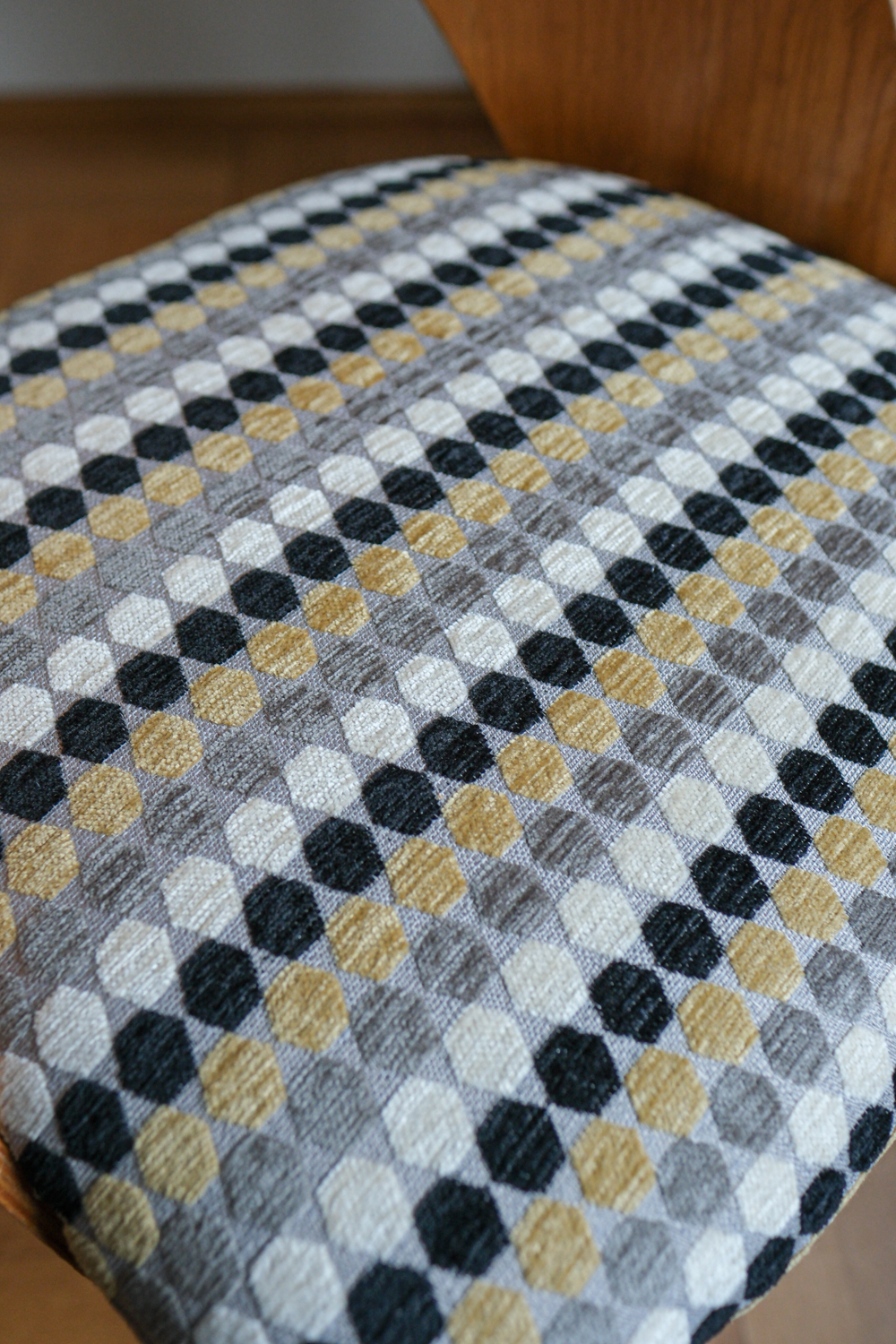 Tvar opěrky působí téměř organicky – jemně obklopuje záda, ale přitom zůstává subtilní. Sedák jsme nově očalounili do geometrické látky, která krásně oživuje přírodní tón dřeva a dodává židli hravý, přesto elegantní rytmus. Dřevěné části jsou v původním stavu, s přirozenou patinou, která k jejímu věku patří. Výsledkem je židle, která kombinuje modernistickou čistotu, pohodlnou ergonomii a výrazný podpis autora.