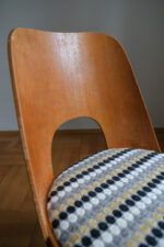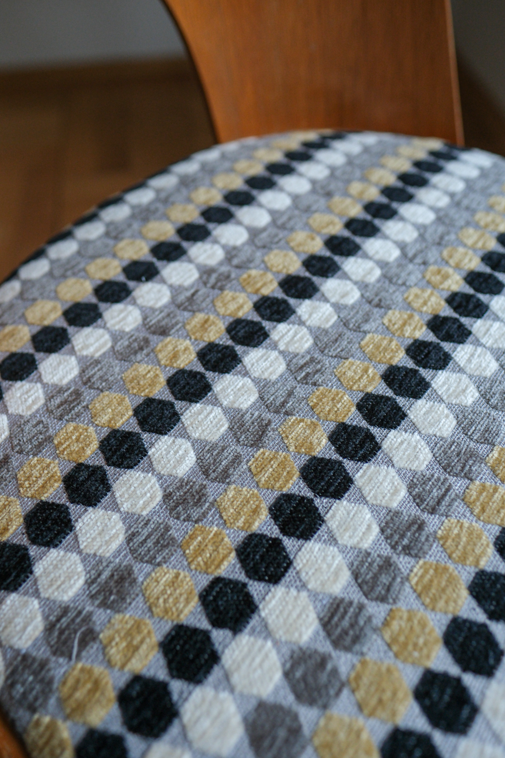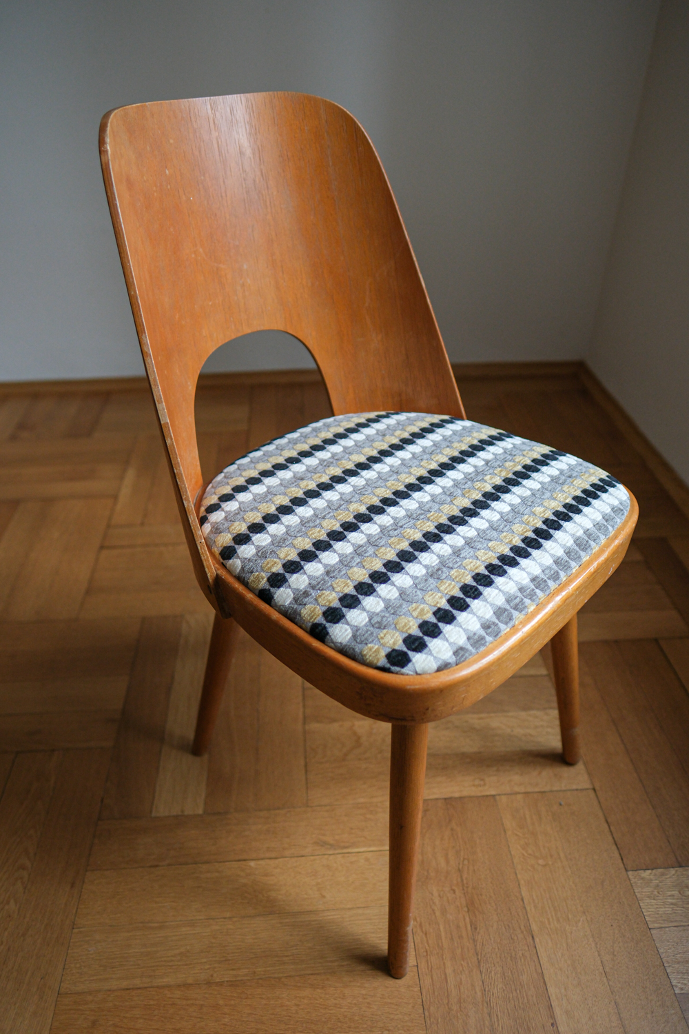 Opěrka se jemně stáčí dozadu, sedák má měkké obliny a celé provedení působí překvapivě současně – přesně tak, jak je pro Haerdtla typické. Nové čalounění v geometrické látce dodává židli živý rytmus a hezky kontrastuje s přírodním tónem dřeva.