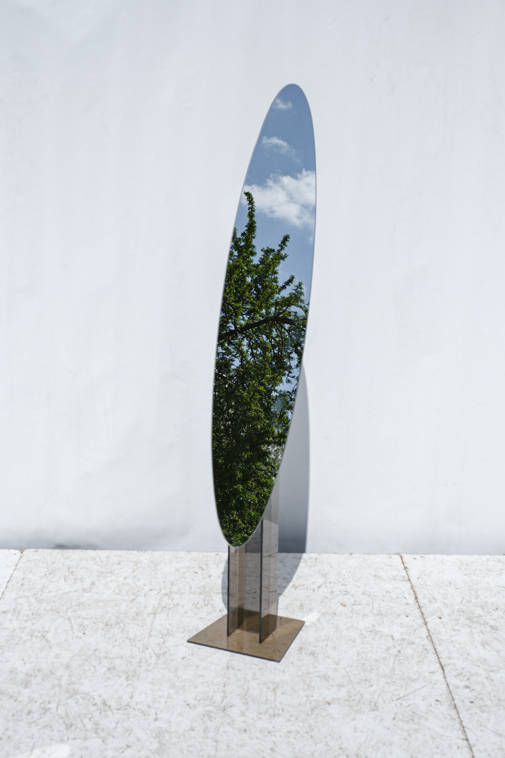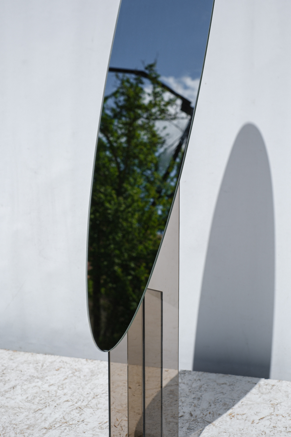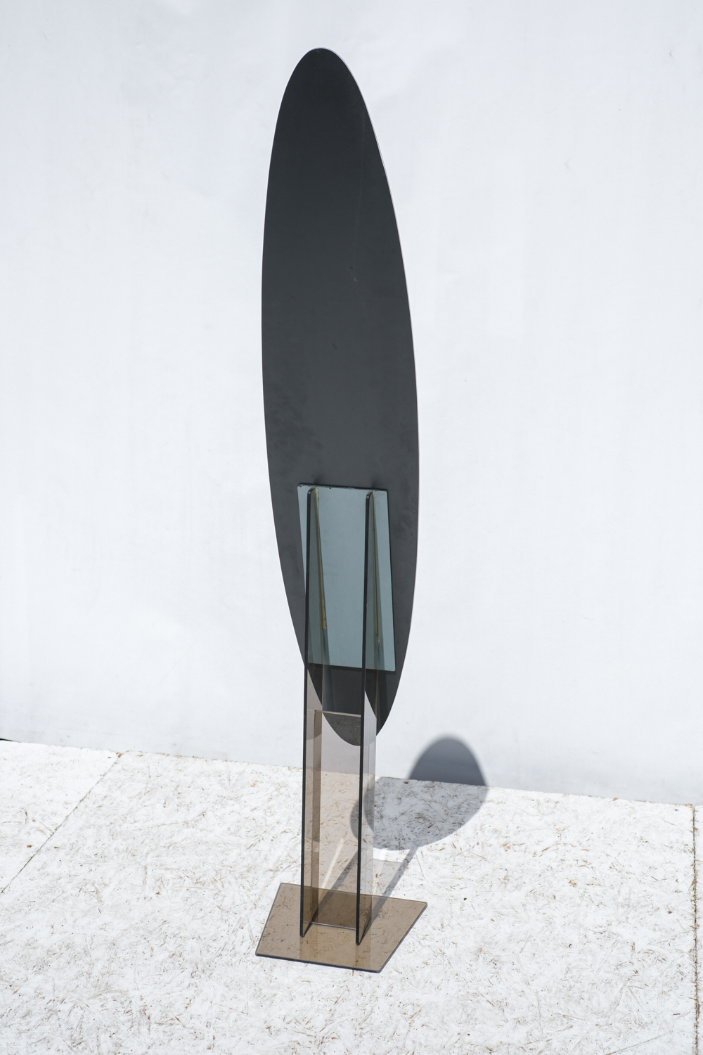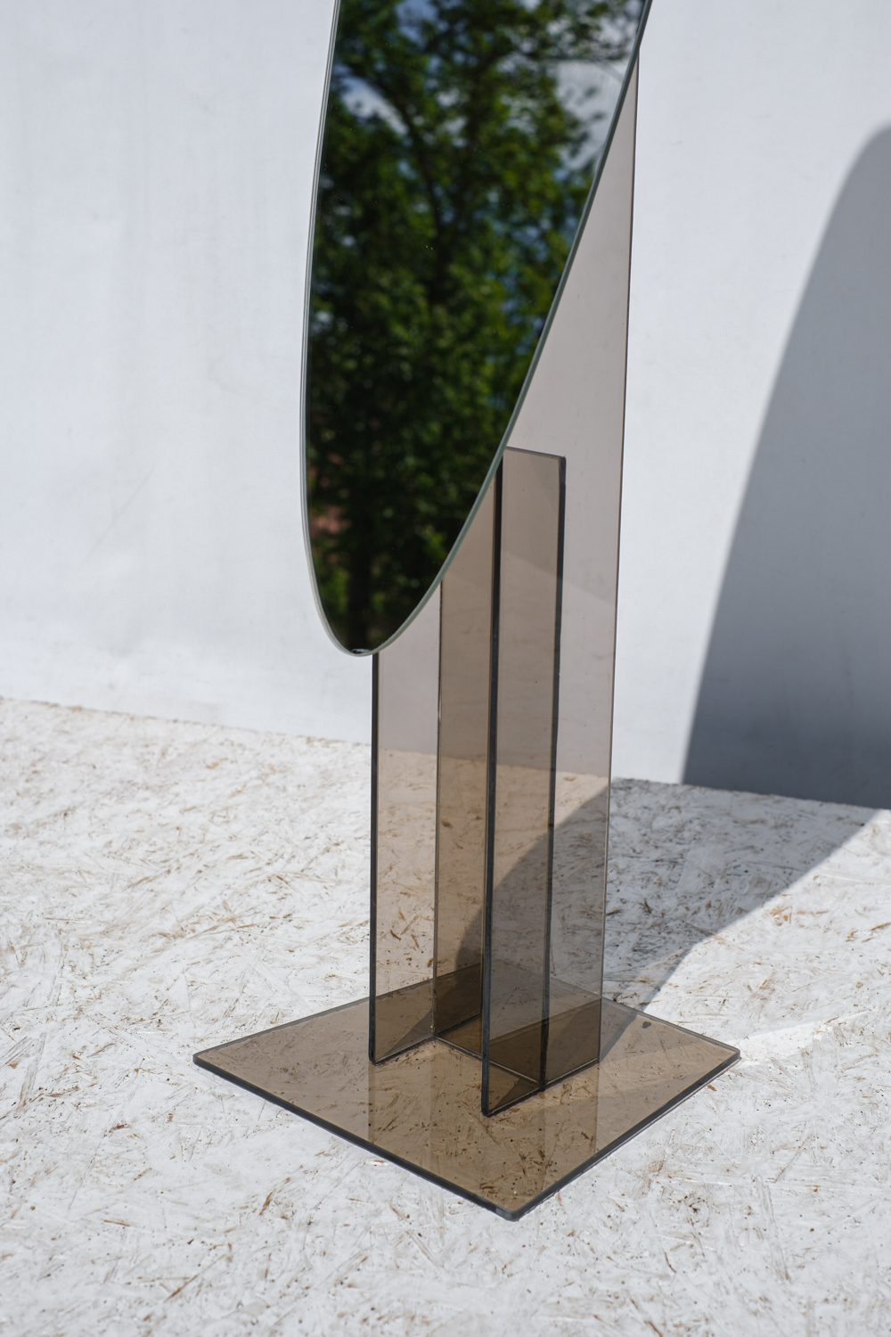 Podlahové zrcadlo s kouřovým skleněným podstavcem, který tvoří sochařský prvek i stabilní základ.